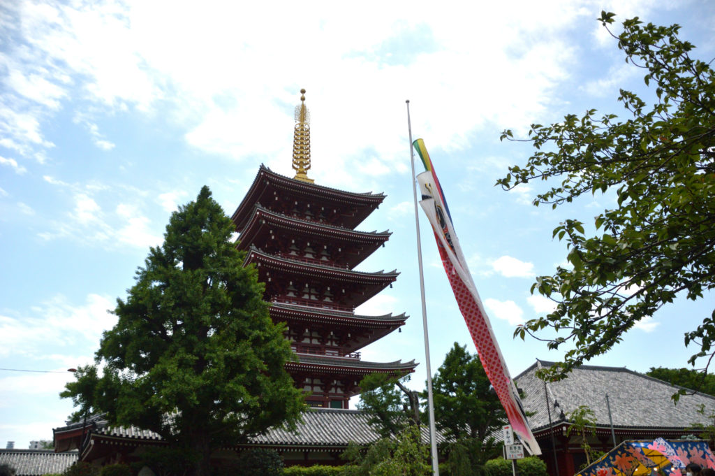 本堂をお参りする前に奥山方面に向かうとこいのぼりと五重塔 風はないので鯉がなびかない