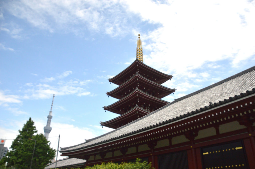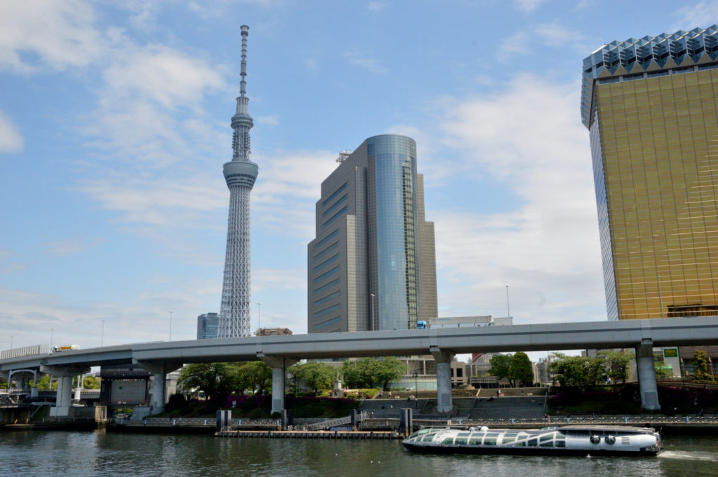 本堂から二天門を抜け隅田川沿いに 首都高と観光船 スカイツリー