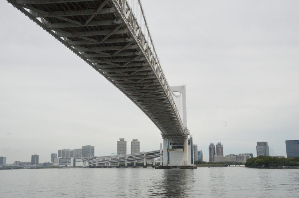 12時30分ごろ自宅出発 六本木 麻布十番 赤羽橋から海岸通りに レインボーブリッジ下の公園に 釣り人が多くいる 何が釣れるのかな 橋の下かお台場を望む