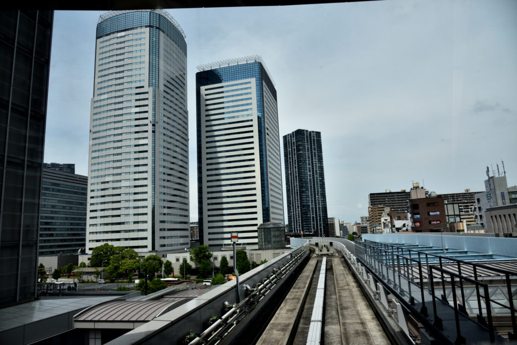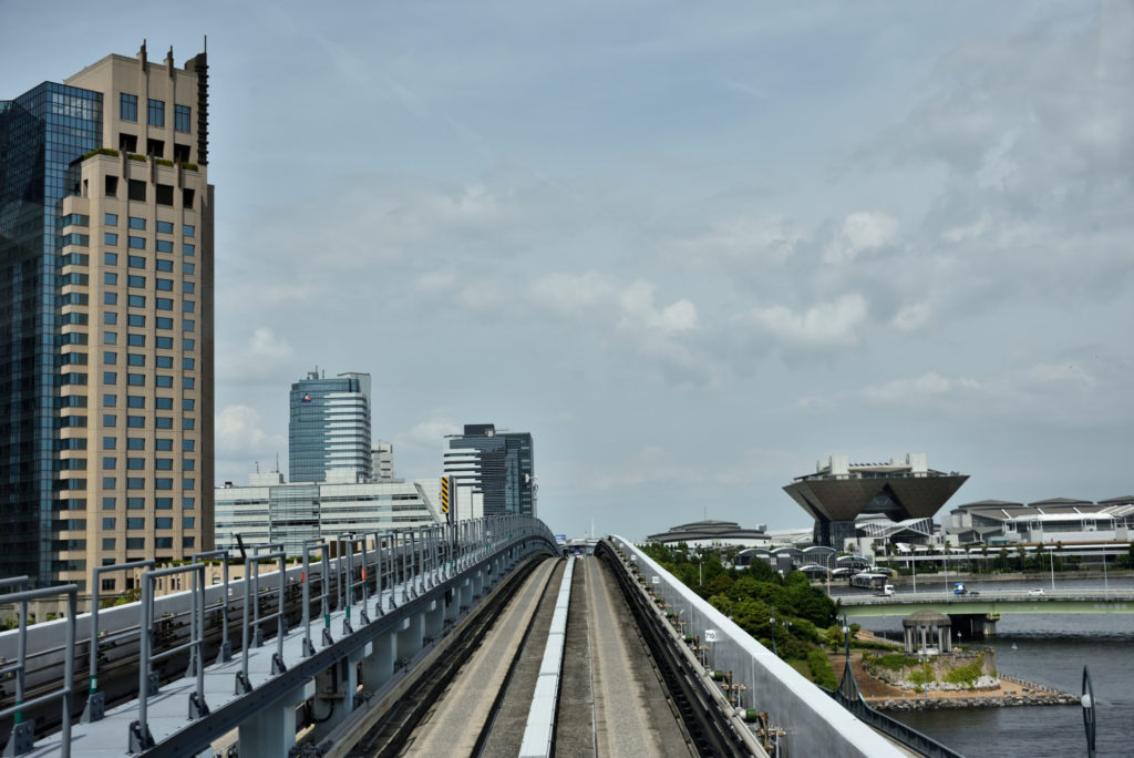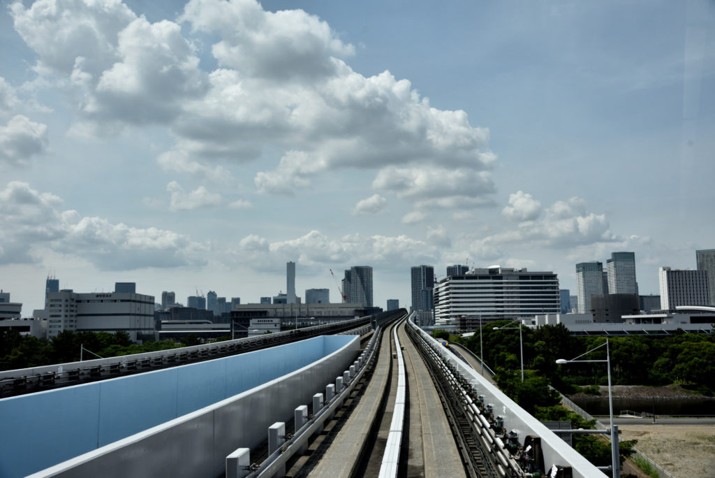 ゆりかもめは地上より高いところを走行 都会の高層ビル街 お台場の高層ビル街を抜けるので 自転車で走行見慣れた風景とはまた違う 東京タワー NECのロケットビルも埋没
