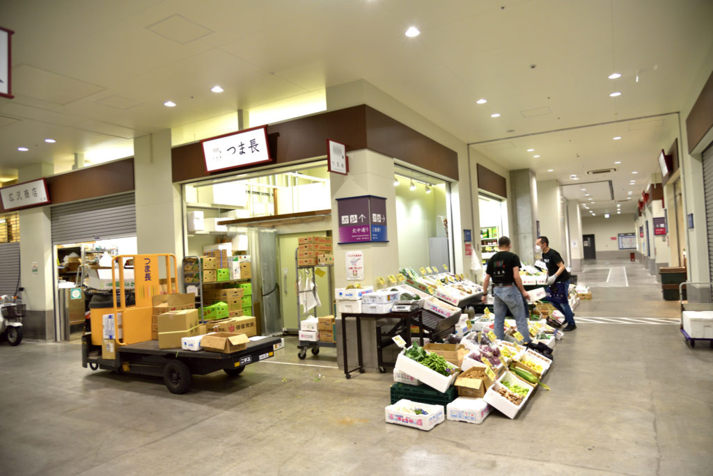 移設前の築地場内では魚仲卸と野菜卸 その他物販が混在していたが豊洲は仲卸は素人入場禁止 その他は物価棟にまとめられ11時ごろなのに結構 しまってるお店が多い 聞いてみたら8時前後が一番ににぎあうらしい