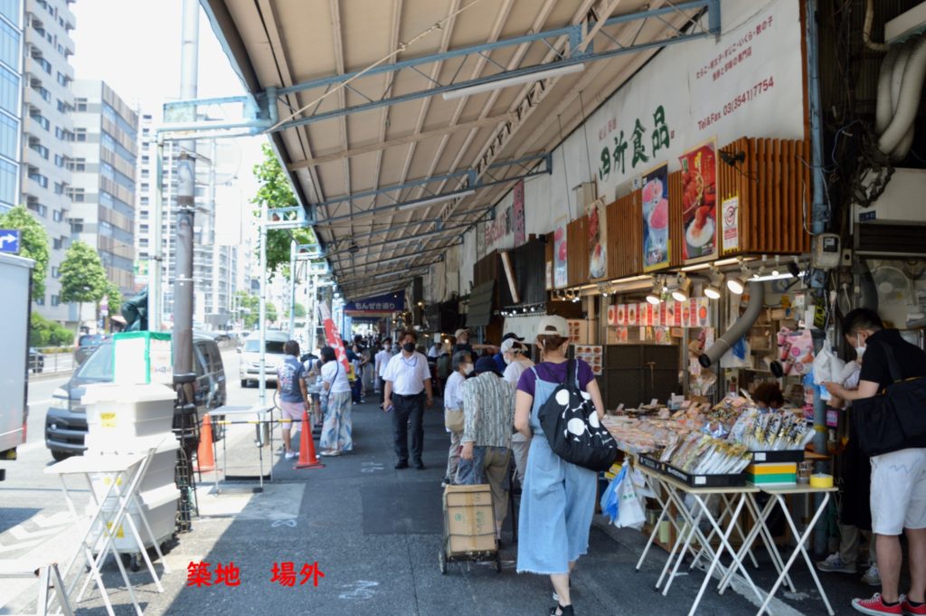 場外は12時前後そろそろ終了の時間 買い物客 観光客は少ないが参議院選挙立候補者の関係者が一生懸命選挙チラシを配布中 波除稲荷神社 7/1-6迄限定御朱印