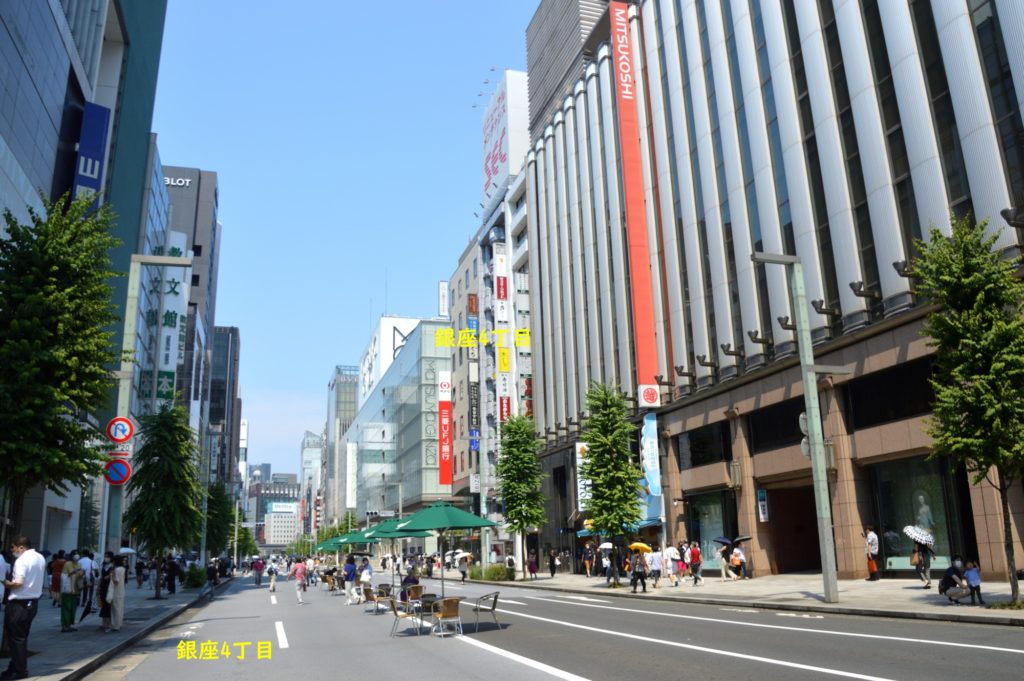 築地から月島 清洲橋から銀座方面に 銀座4丁目 交差点から日本橋方面 歩行者天国 暑いので人が少ない