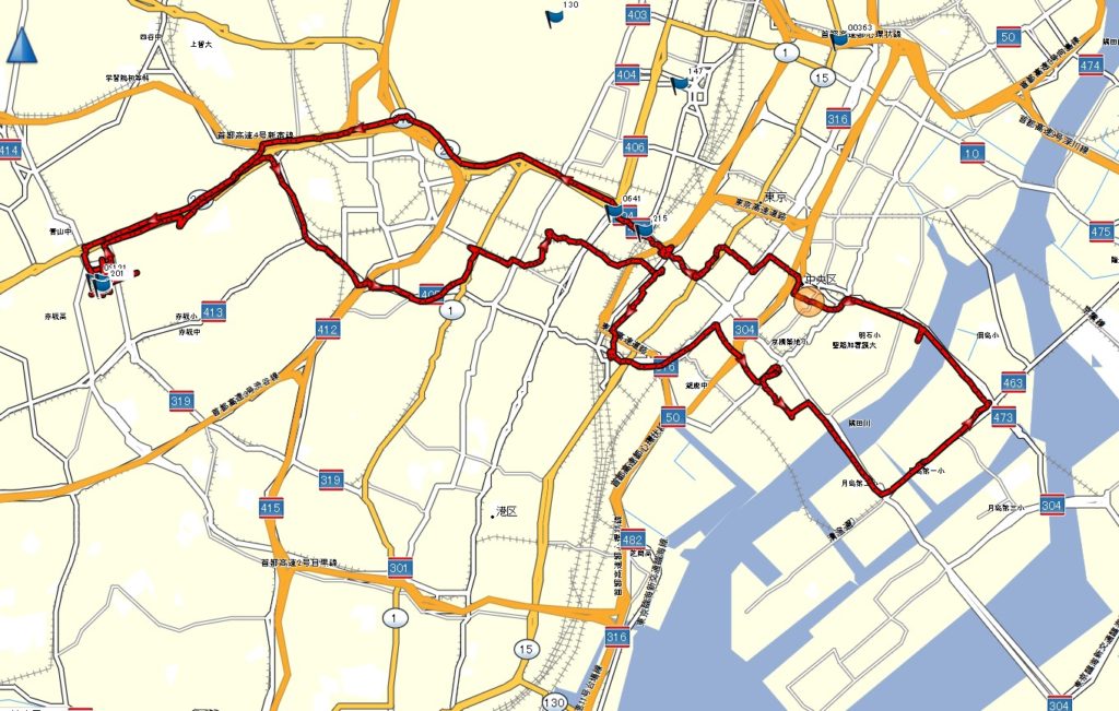 自宅から赤坂区役所で不在者投票 赤坂見附から虎ノ門 日比谷公園を抜け 数寄屋橋 新橋 築地から月島を抜け銀座4丁目に 日比谷濠から三宅坂から帰宅 22.6km