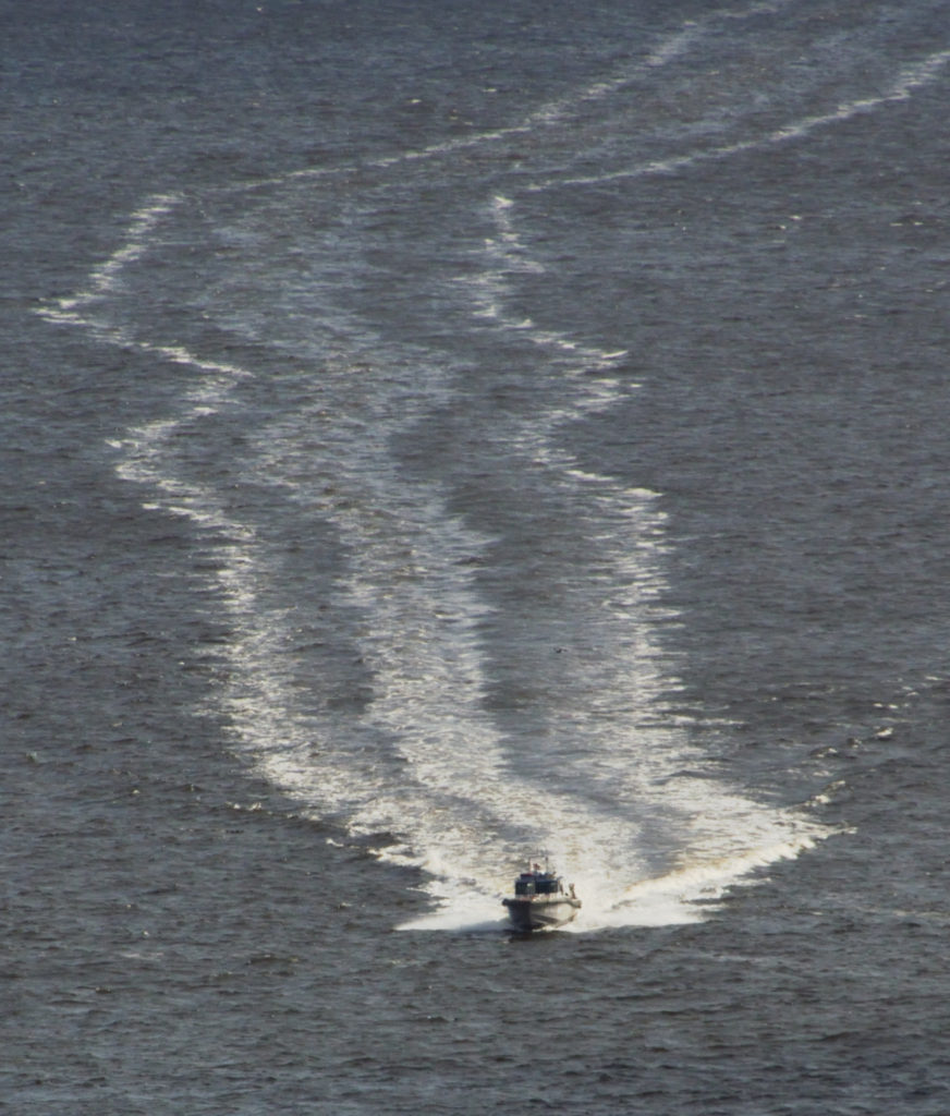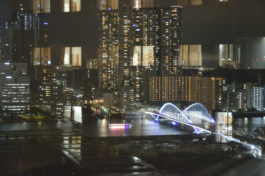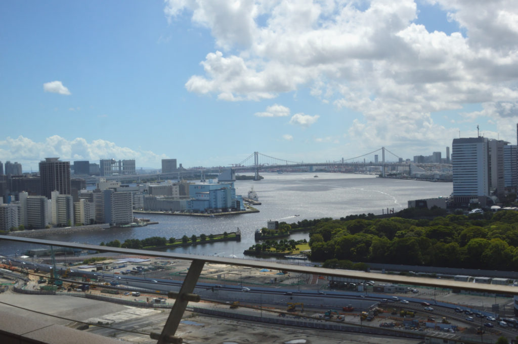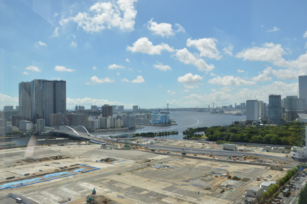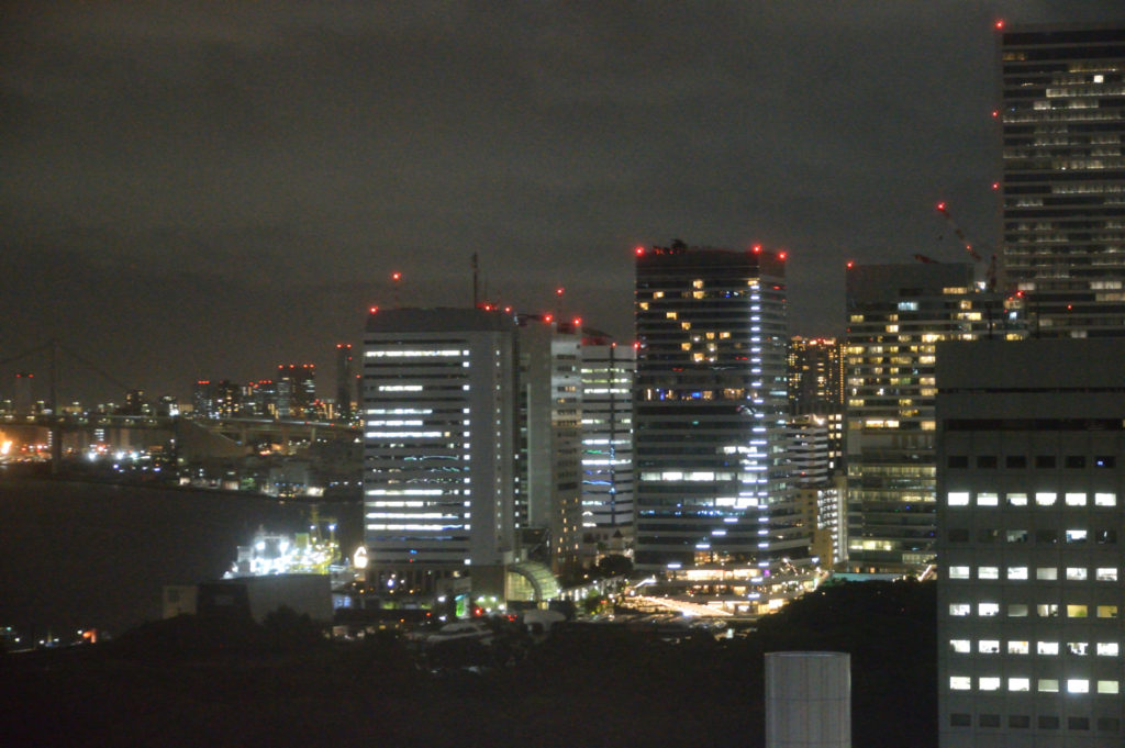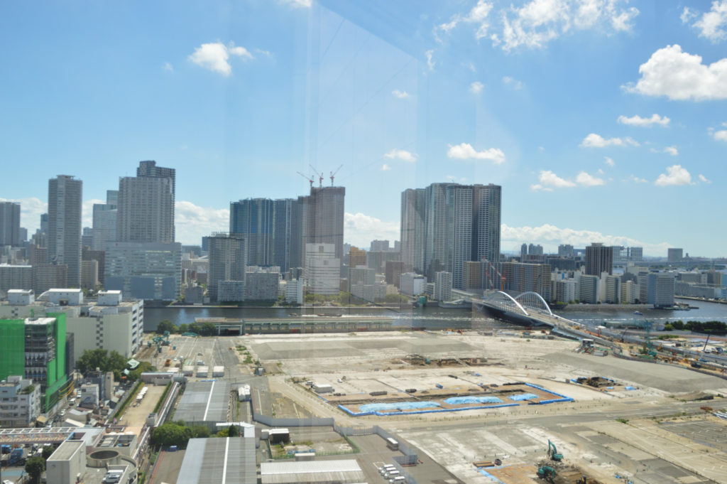 病室から東京湾 奥にレインボーブリッジ 手前の黒く見えるのは浜離宮 隅田川河口 この日しか青空はなかった