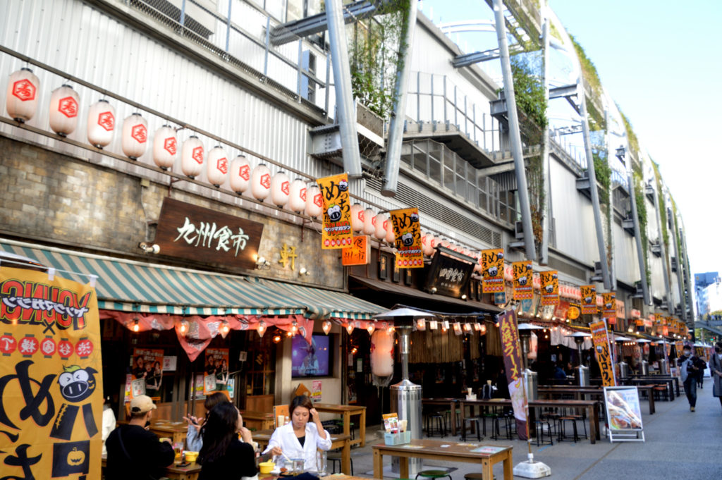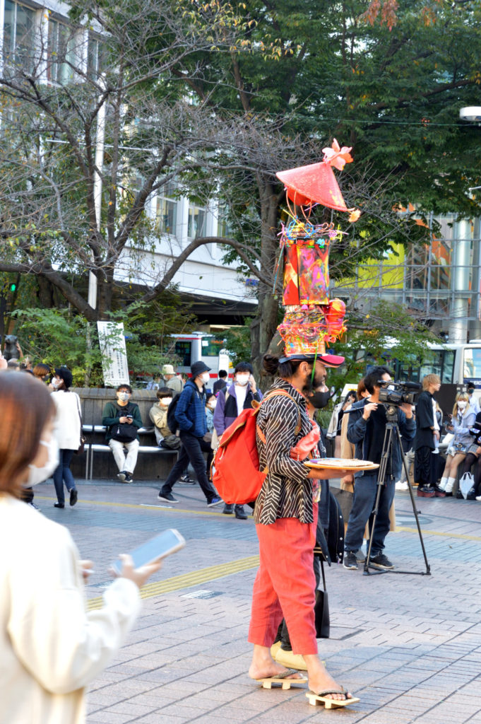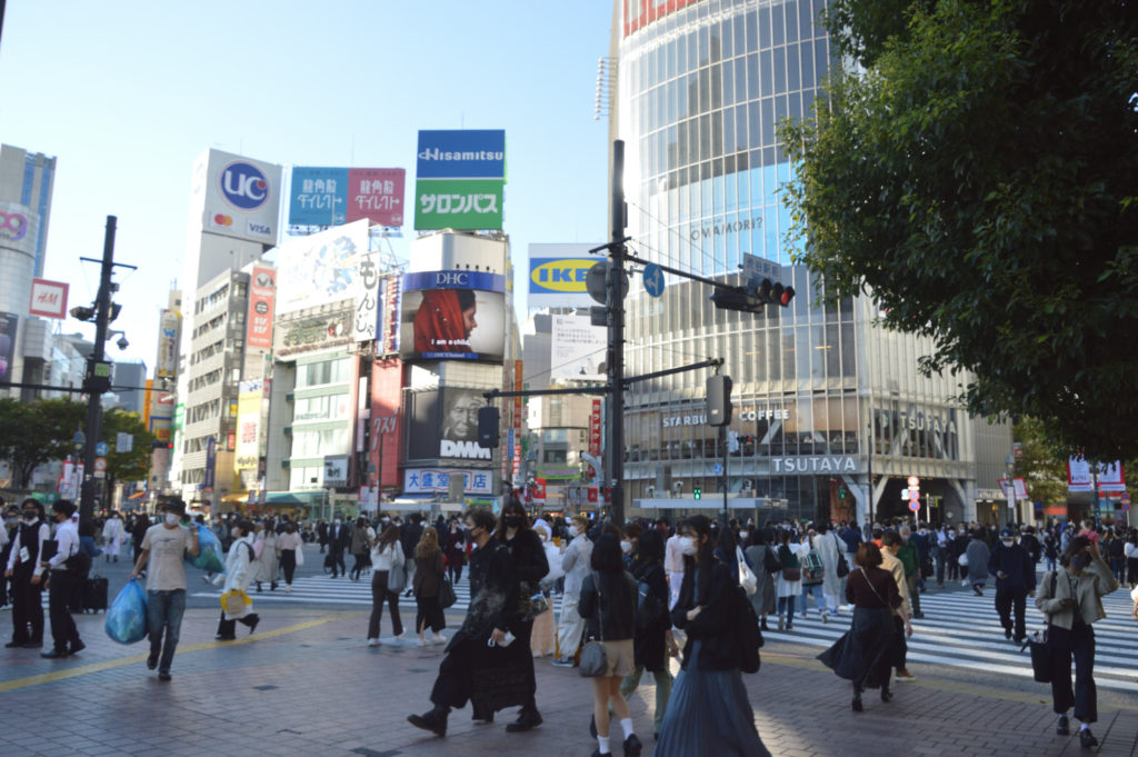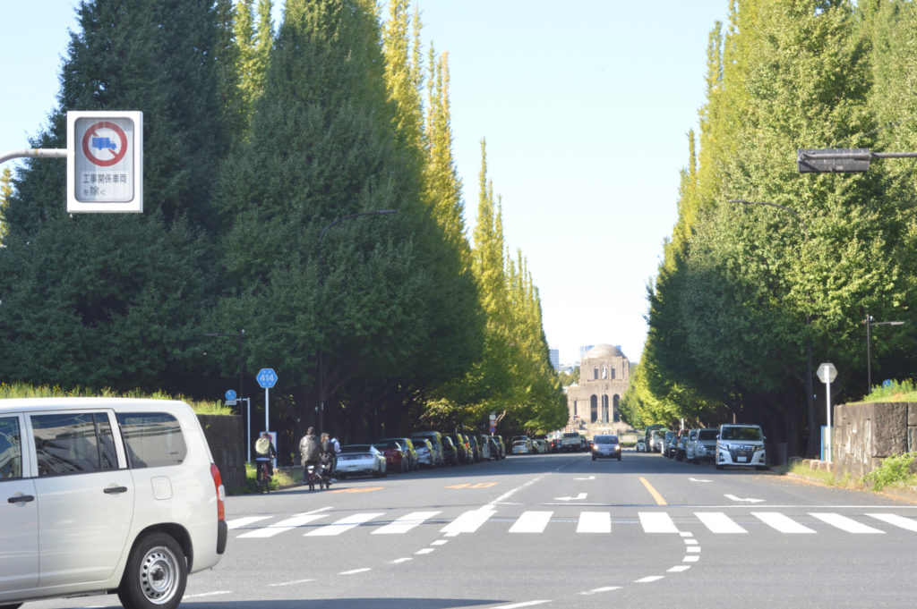 帰宅後女房と渋谷まで買い物を兼ねて散歩 イチョウ並木 今後葉が黄色くなり葉が散る 根元には銀杏が落ちてるが小粒なのか広いに来てる人がいない