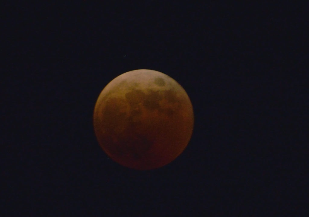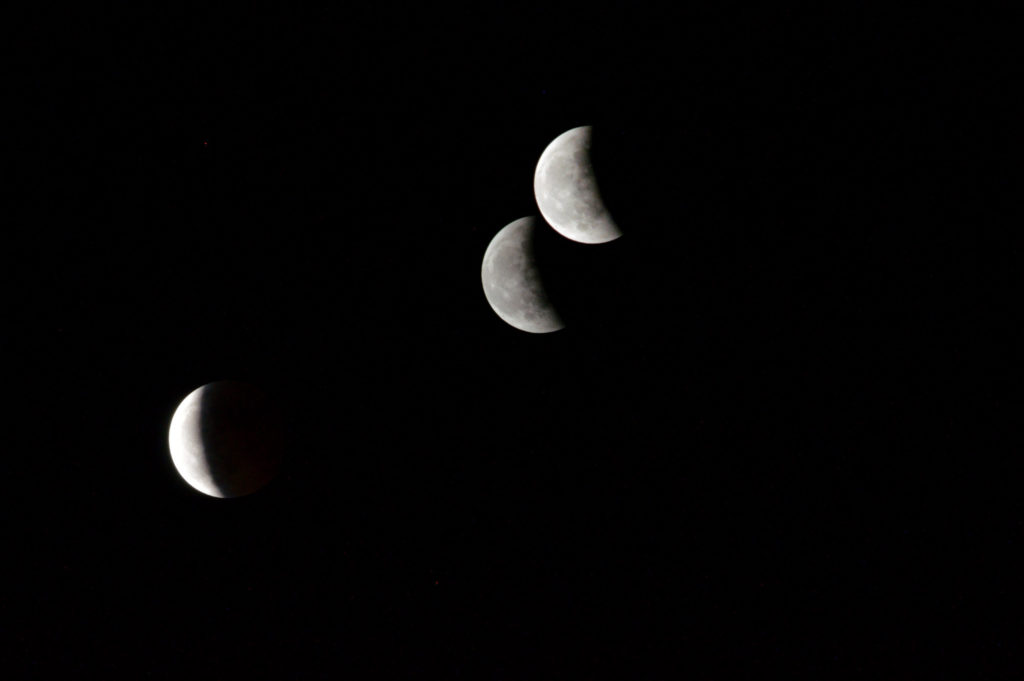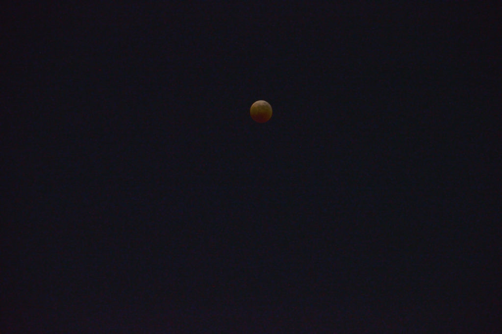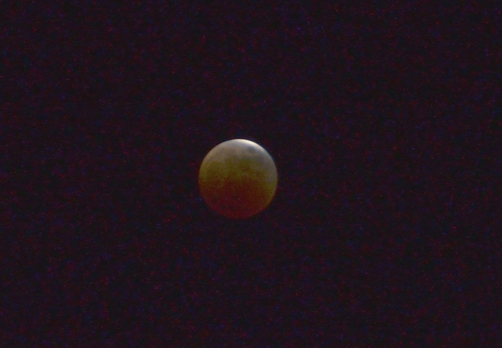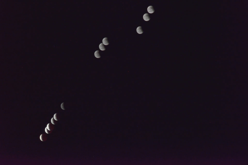 11月8日の夜、皆既月食が起こります。月は、18時9分から欠け始め、19時16分に皆既食となります。皆既となった月は、「赤銅色(しゃくどういろ)」と呼ばれる、赤黒い色に見えます。皆既食は86分間続いて20時42分に終わり、その後は徐々に月は地球の影から抜けて、21時49分に部分食が終わります。電車が遅れ帰宅が遅れつきがかけはじめてから撮影開始