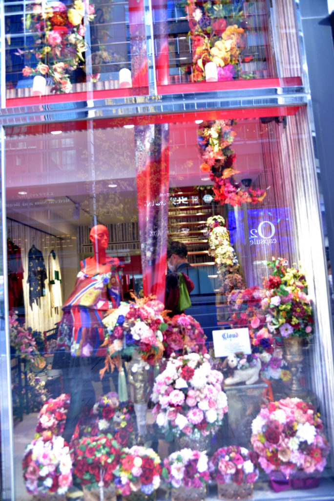 銀座4丁目交差点から新橋方面に 花がいろいろなオブジェにして飾ってある 店名 不明