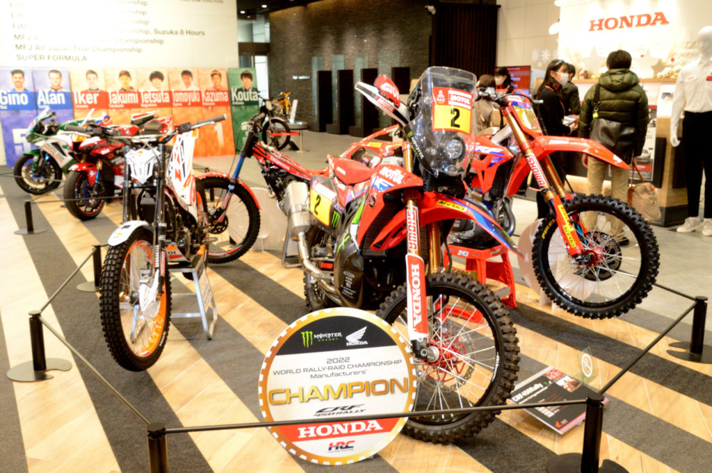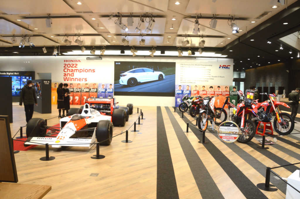 青山一丁目交差点にあるホンダショウルーム 案内の文章 借用 12/13-27迄 2022年シーズン、チャンピオンを獲得したチームとドライバー・ライダー達の栄光を称えると共に、