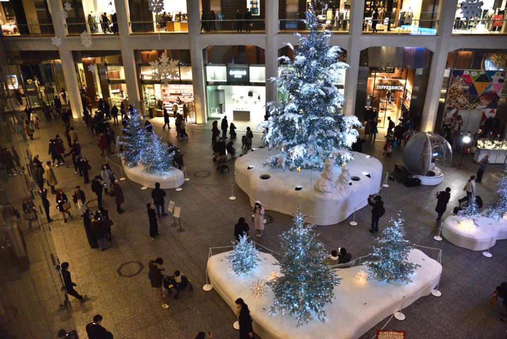 2022年のWHITE KITTEのテーマは「KITTEの森 Winter Forest Christmas ~自然からの贈り物~」をコンセプトに、後世に繋いでいきたい、美しき日本の森を表現 本物のもみの木を使用した、全長12mのツリーが出現。高さの異なる9本のツリーは、東京都檜原村の間伐材と群馬県嬬恋村のもみの木を使用しています。さらに、ツリーを見上げた先に広がる雪の結晶は、森の中に降り注ぐ雪を表現し、大小様々な姿で天井より繊細に降り注ぎます。雪の結晶には牛乳パック100%再生紙からできた「ミルダン」を使用 時間で色が変化する