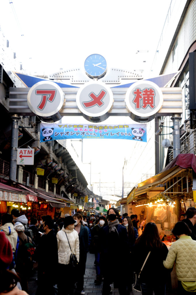 上野アメ横 今日は平日 このような人出 しゃべる言葉が日本語じゃない 観光客? 観光客だと生物は除くだけ 飲食店は満席