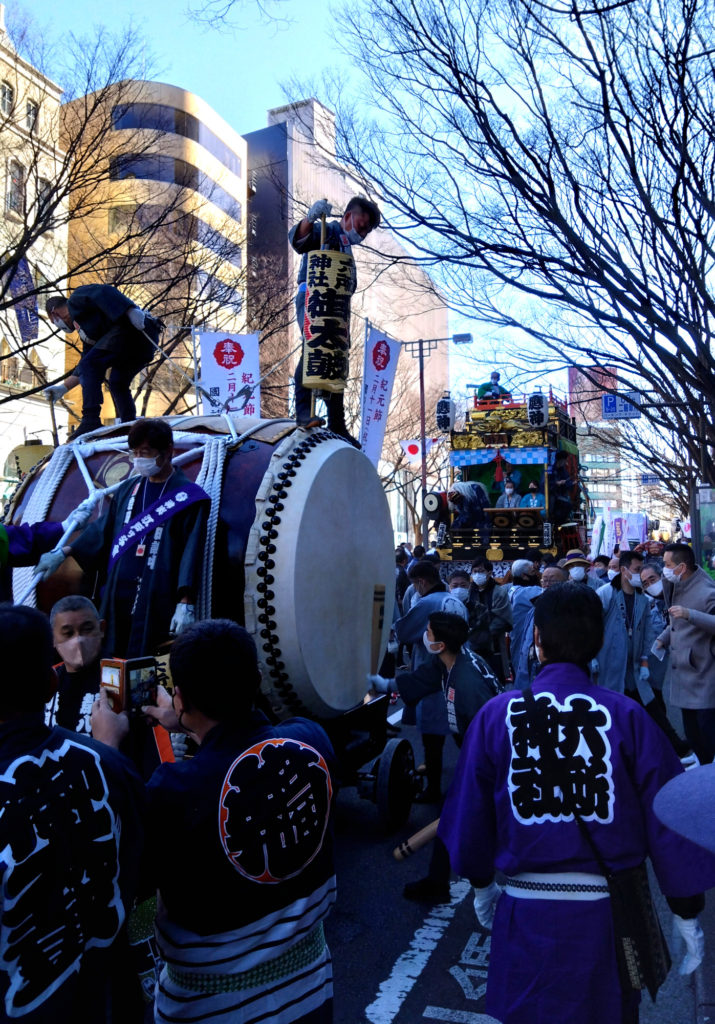 先導車の後に太鼓 山車 神輿と続く