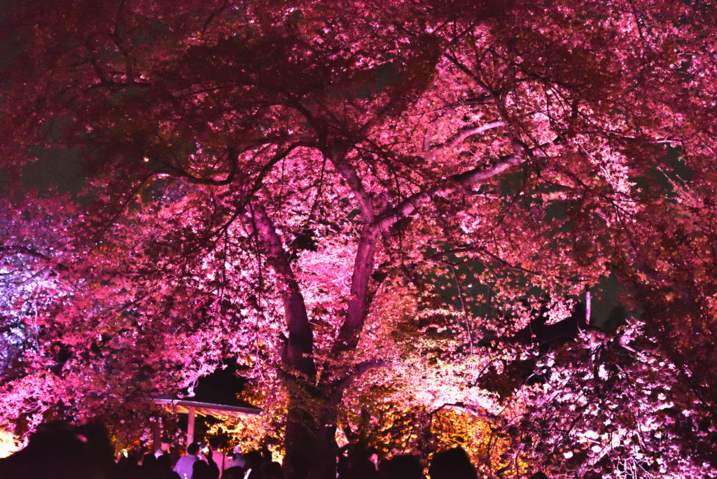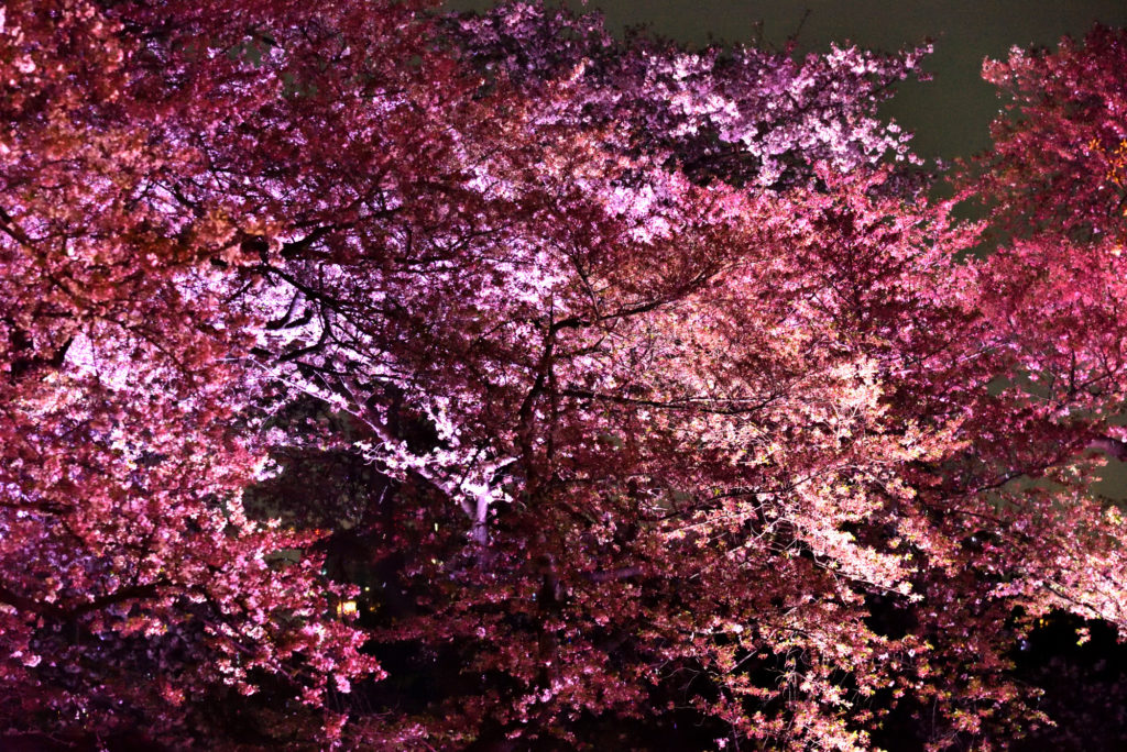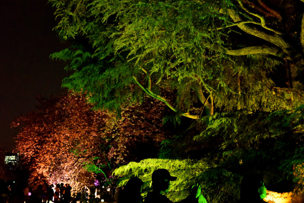 さくらはダイダイ 緑の木はグリーンでライトアップ