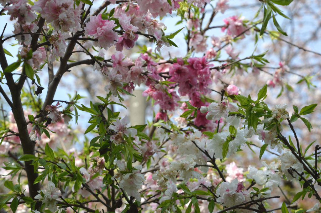 1本の木から紅白の花を咲かせるハナモモ