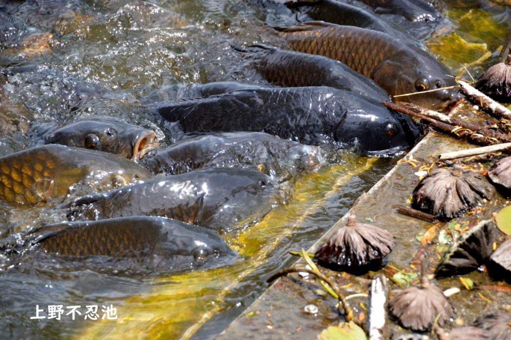 弁天堂に入る直前にある小さな石橋から鯉に餌をあげてる人がいる 餌に群がる鯉の群れ