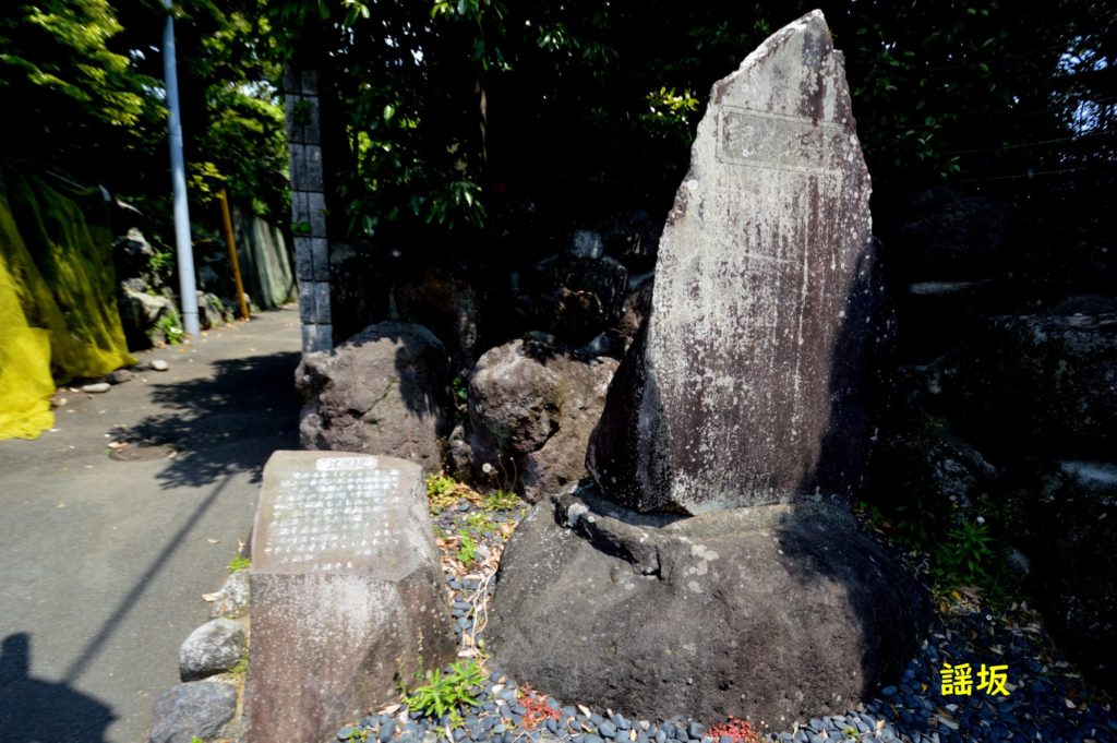 船出浜から坂を上ると 謡坂 橋山合戦で敗れた頼朝主従は、土肥椙山中を転々とし真鶴半島へ駆け込みました。危機を脱した土肥実平が喜びのあまり思わず頼朝の御前で舞を舞ったと伝える 謡坂が真鶴駅から岩海岸へと続く道の途中にあります。