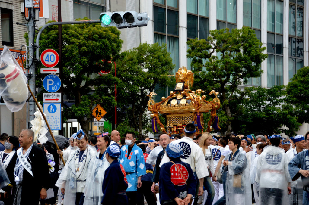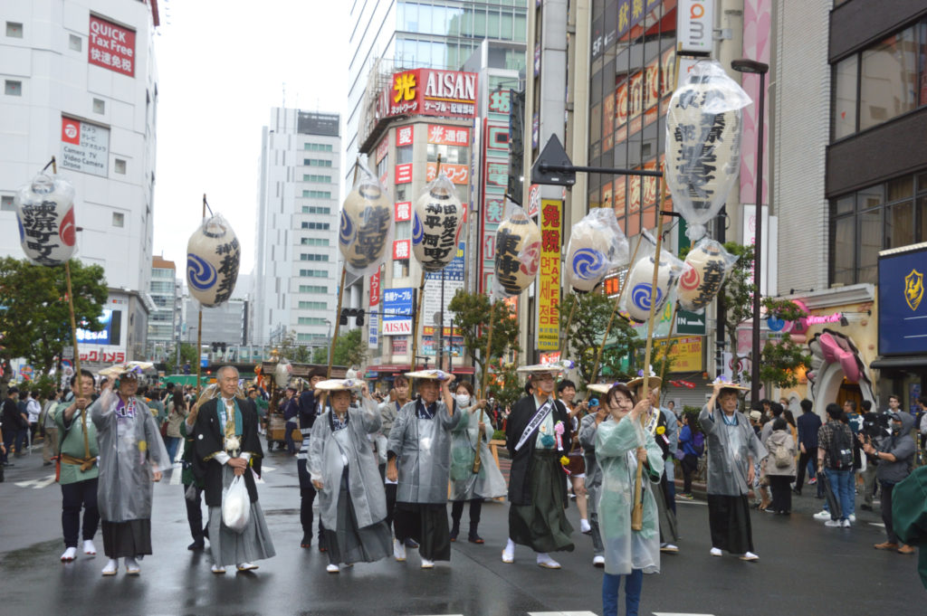 コロナ禍で4年 中止が続いていた神田明神 神田祭 小雨が降る中見に行く 神田明神境内は各町会の神輿が宮入りするので最高に盛り上がるが 人が多くあきらめた 万世橋を渡り蔵前通りと新妻恋坂が交差する 四差路で宮入をする各町会の神輿を待つことにした