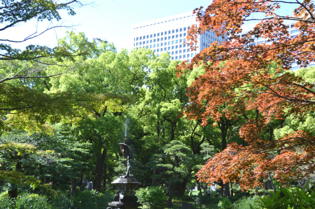 日本庭園 緑が濃く又橙色のもみじ その間を鶴の噴水が