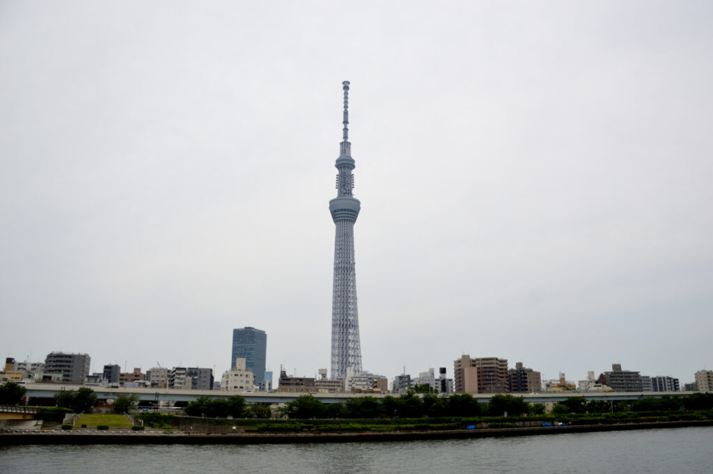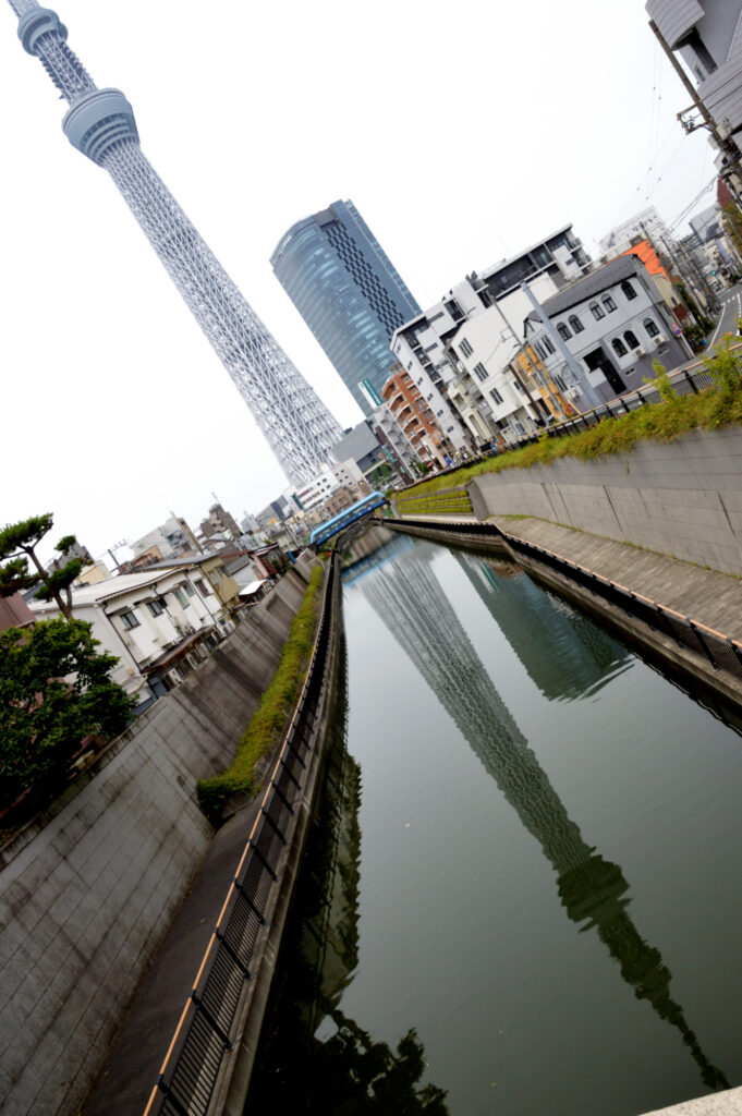 スカイツリー足もとから 十間川に映るスカイツリー青空でないのが残念