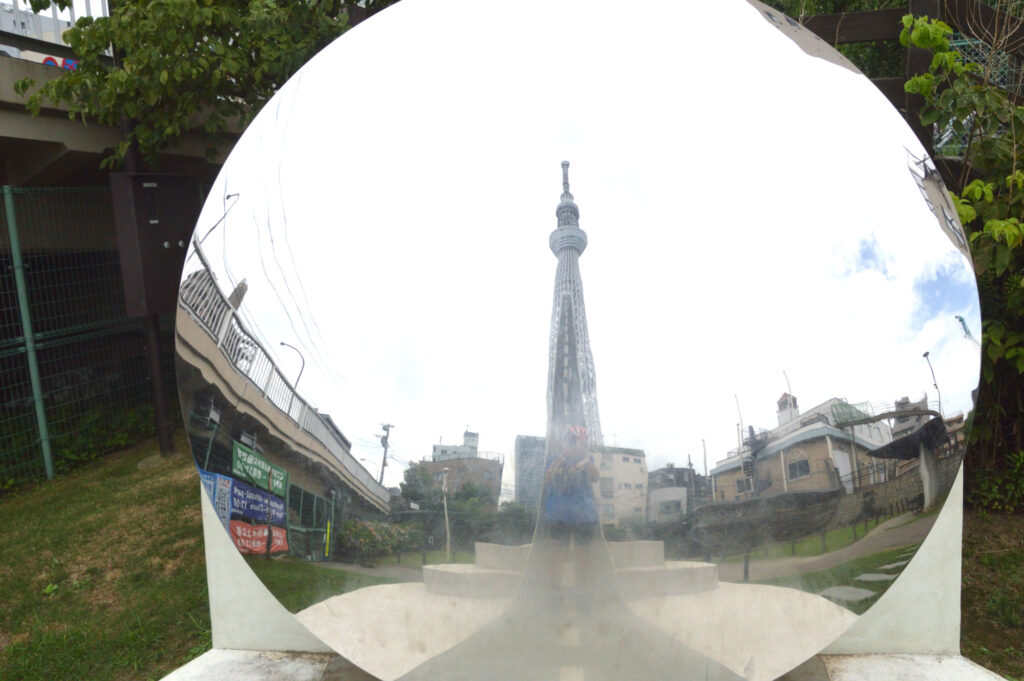 東武橋袂にある円形の鏡面仕上げの鏡から