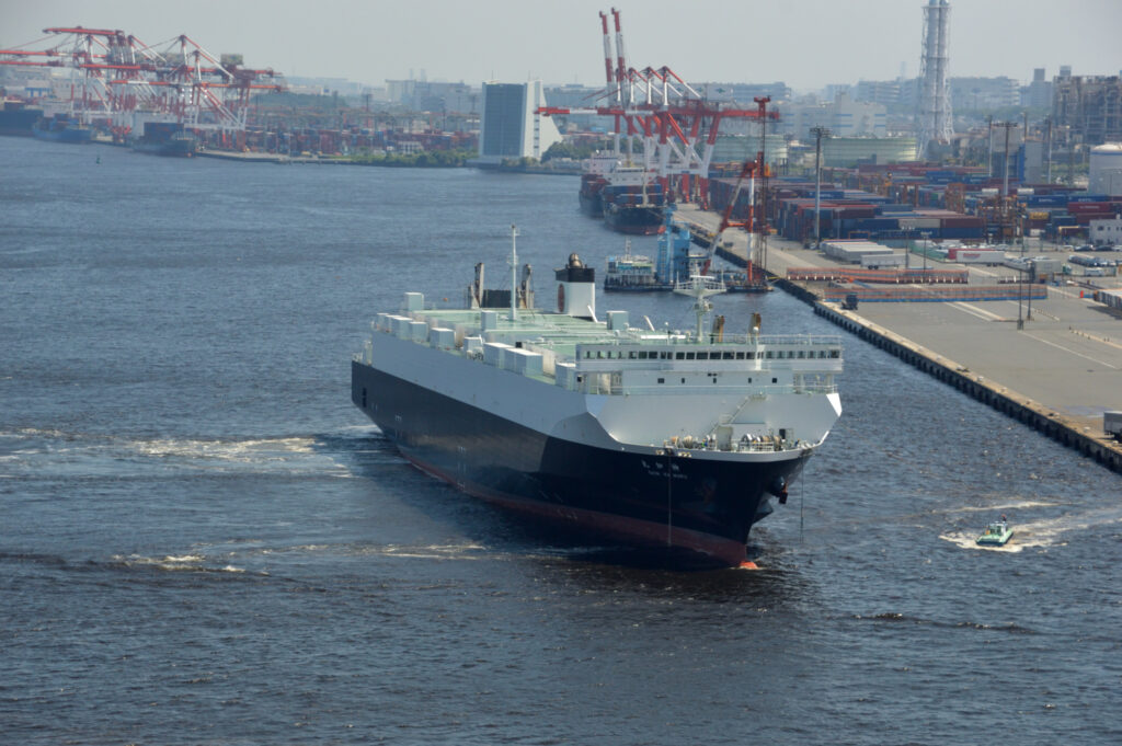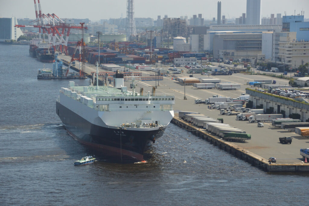 レインボーブリッジは自転車走行不可 後輪に台車を装着 押してわたる エレベータで7Fまで登り橋のたもとに 品川ふ頭に大型貨物船が接岸中 タグボートが活躍中