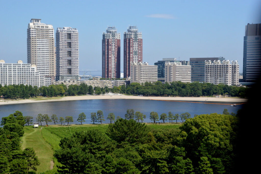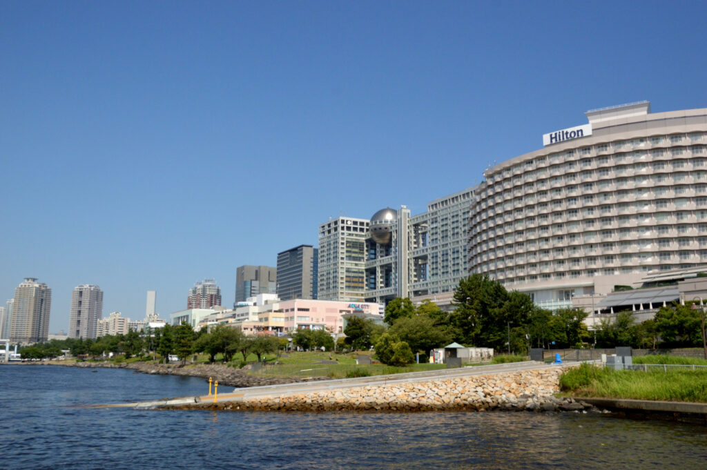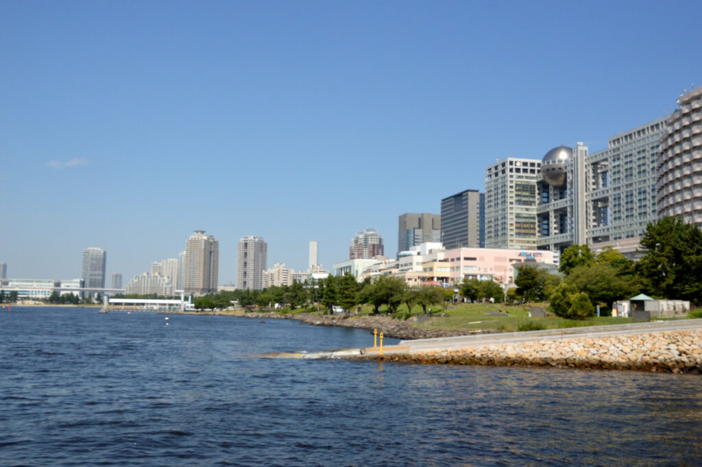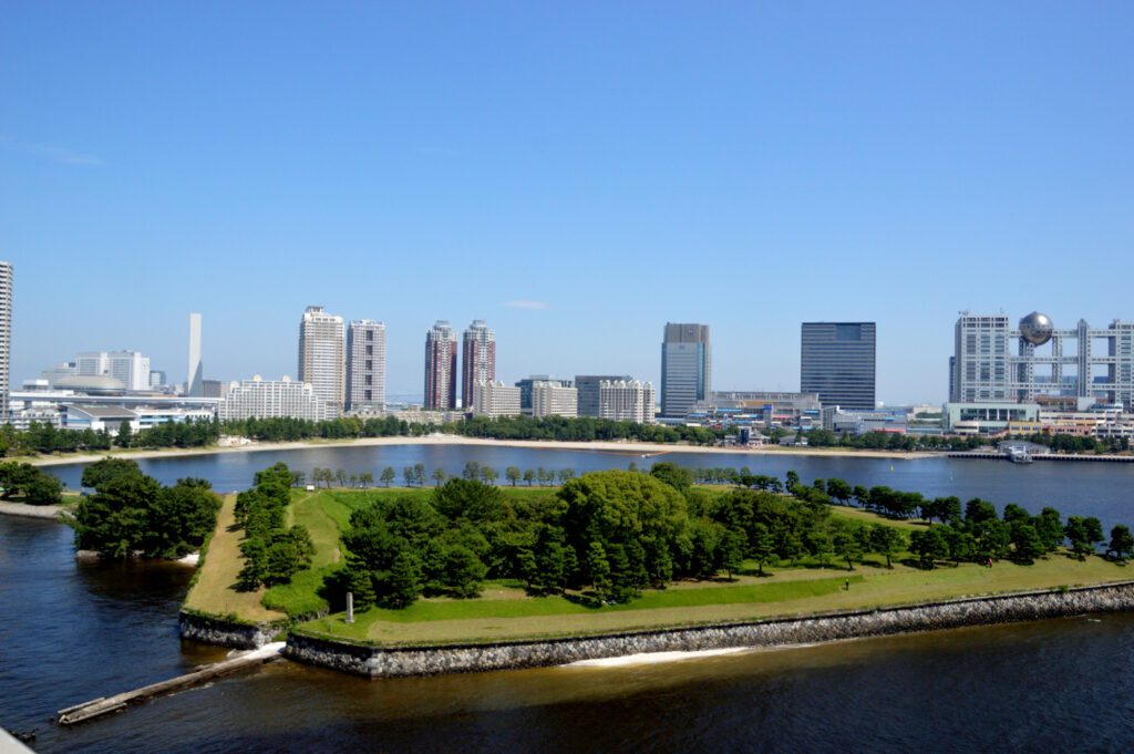 公園真下からお台場方面 右手奥 フジテレビ 手前の島は第六お台場 上陸不可