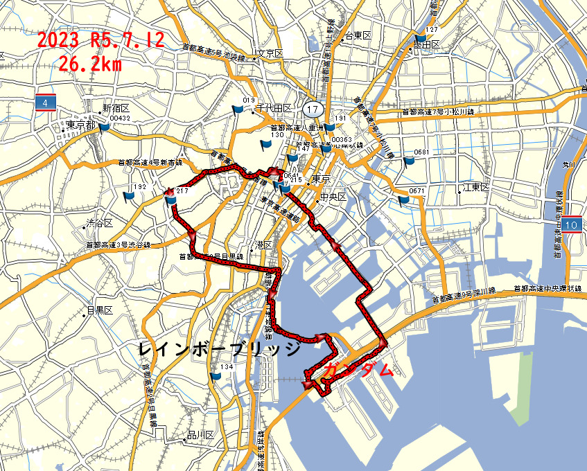 自宅を出て六本木 浜松町を抜け海岸通りに 最初に行くのはレインボーブリッジ下の公園