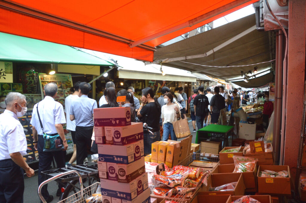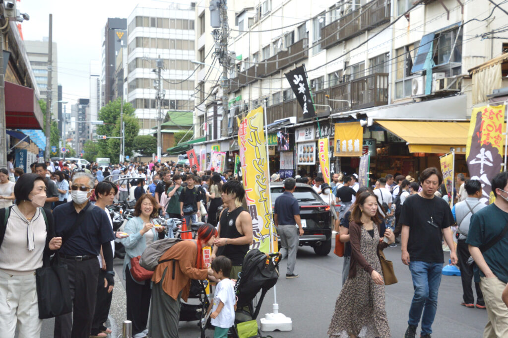 築地場外メイン通路 立ち食いの飲食店が多く並ぶ おにぎり 海鮮 玉子焼き等々 観光客 インバウンド 実感する