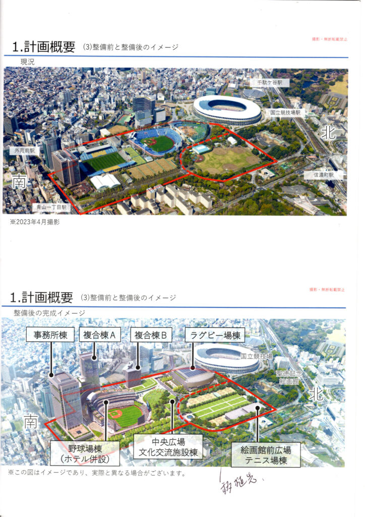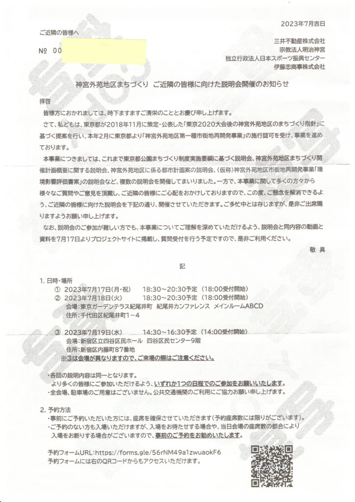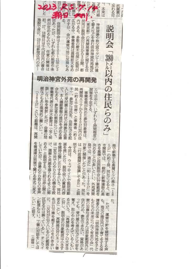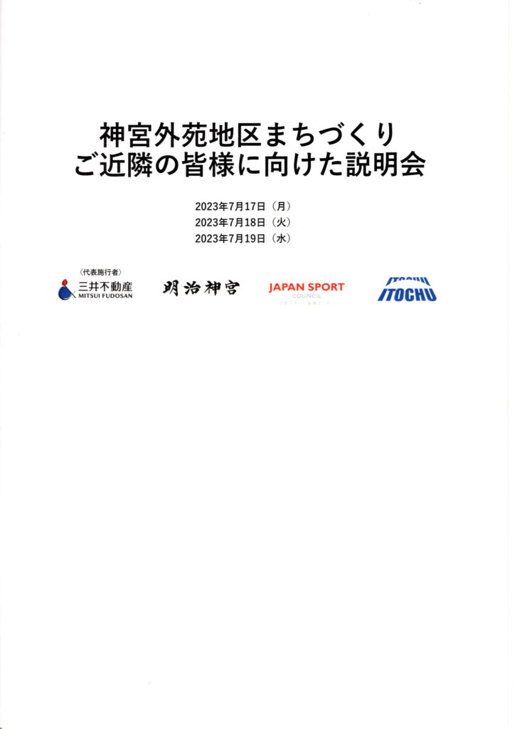 7/17 赤坂プリンスで神宮外苑再開発事業の説明会に行ってきた 開発業者は 三井不動産 明治神宮 伊藤忠商事 日本スポーツ振興 4団体 高層建築190mも2倍 参加対象者は半径380mの住民に事前配布 通し番号 住所 氏名記入 本人であることを入場時確認されるとのこと 結局マスコミ等で騒がれたので用紙を持ってる人は問題なく入場できた 何んで高層ビル2棟必要かは説明不十分で 我田引水 納得できなかった 神宮球場 再建になおかりた 再開計画 東京都から近隣に説明するよう指導があったので開催した 企業のガス抜き 銀杏並木は手を付けない等々 内部撮影は不可 会場の画像を