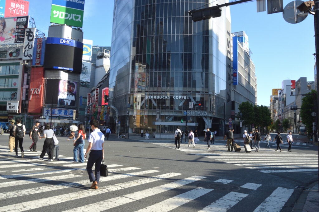 渋谷スクランブル交差点 7時過ぎ まだ人通りはこの通り