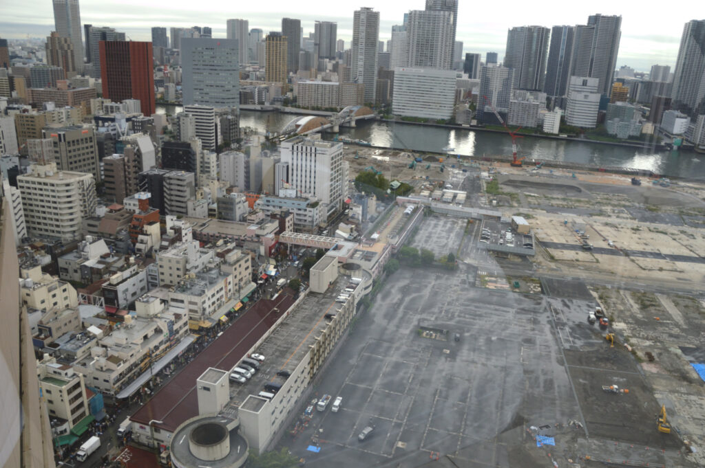 採血も終わり19階の休憩室より展望 右手が築地場内跡地 奥は隅田川 勝鬨橋は化粧直し中 左手は築地場外
