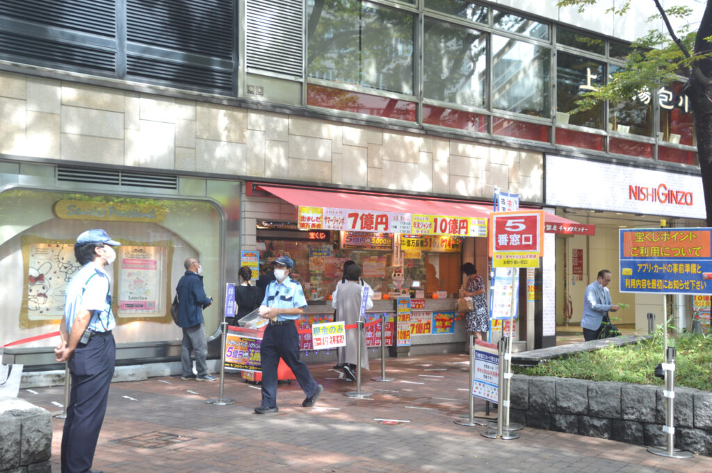 帰路 西銀座宝くじ売り場 高額当選者続出の売り場 ハローイン宝くじ 発売 本当は最終日に買いたいのだがその時は長蛇の列が予想1-2時間待ち 今はすぐ買える 当たりますように