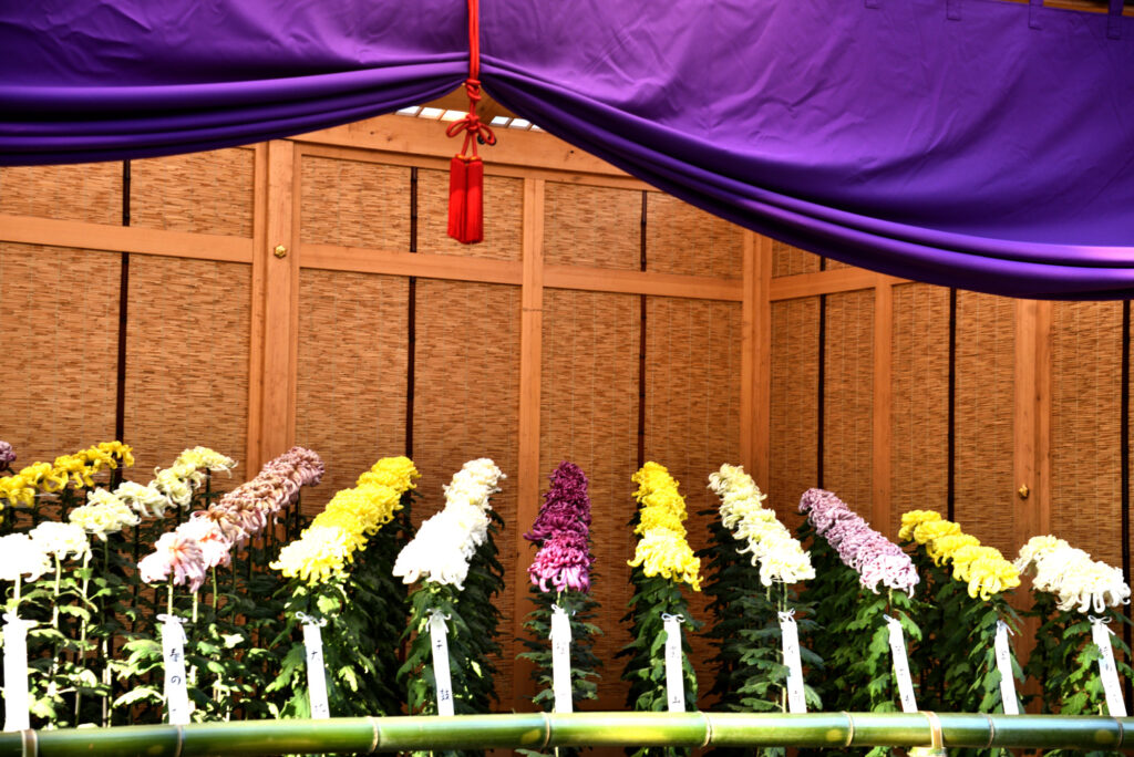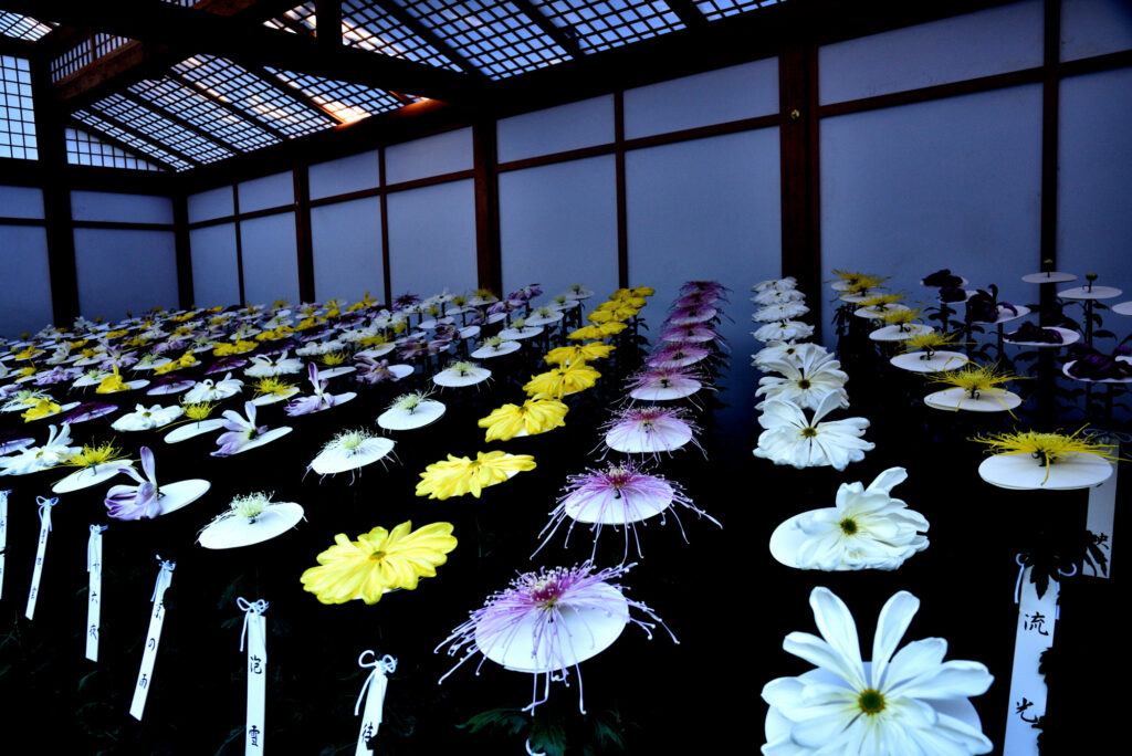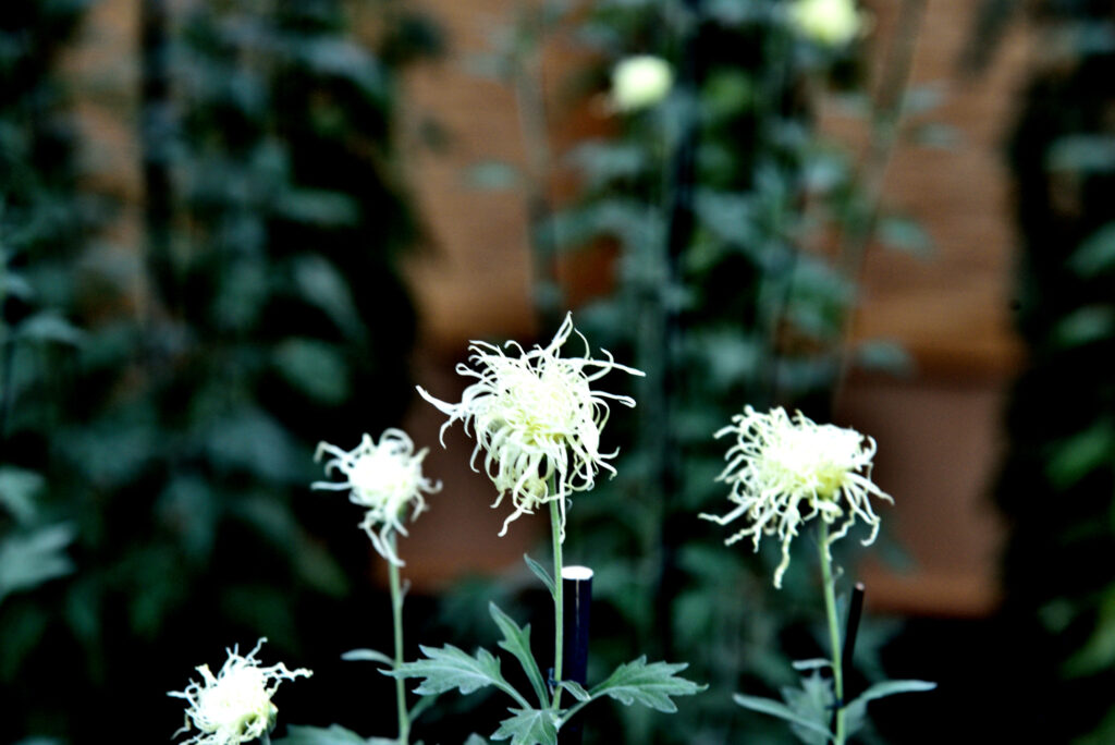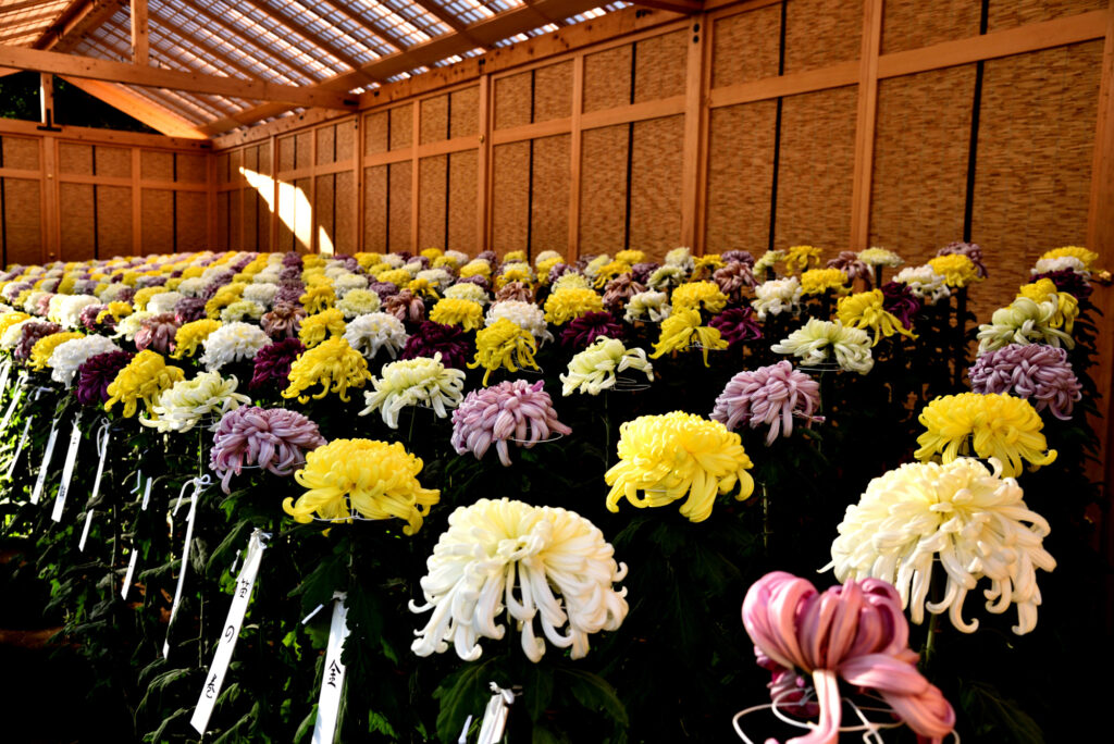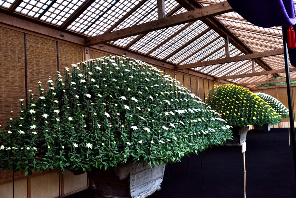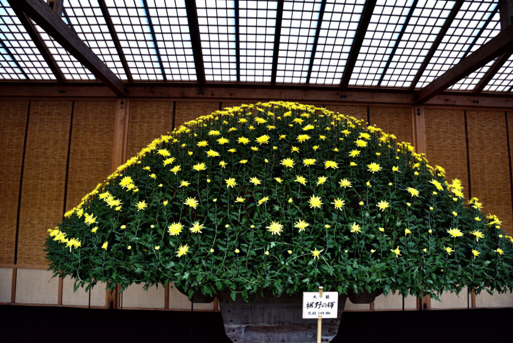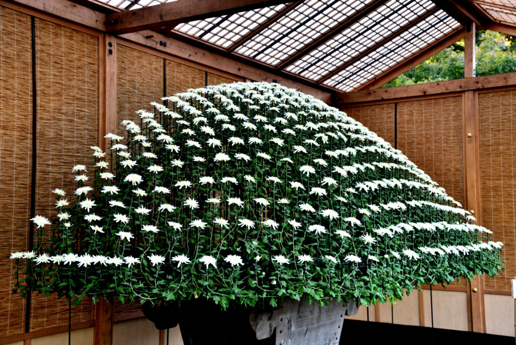 新宿御苑の目玉 大作つくり 花が1本のきくから500以上咲かす まだ5分咲き 菊は大輪のきく 1本の菊を選定 5本に ここから2年かけ育て 8月頃から大作の金具にに這わせ始め折れないように丹精を込めて這わす 裏側に何本かは予備があるらしい