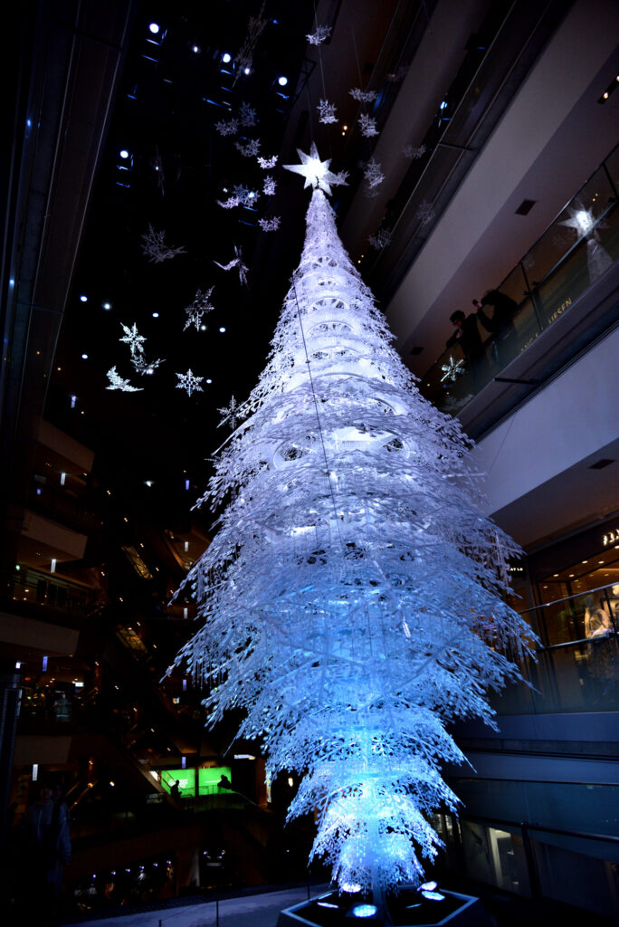 今年のクリスマスイルミネーションは「RE-CRYSTALLIZED~再結晶~」をテーマに、高さ10メートルからなる世界最大級の”3Dプリンター製のクリスマスツリー”が登場。約500個の雪の結晶から作られたツリーは、その殆どがPET素材※1を原料に3Dプリンターで作られており、100%リサイクル可能な環境負荷の少ないサステナブルなクリスマスツリーとなっています。