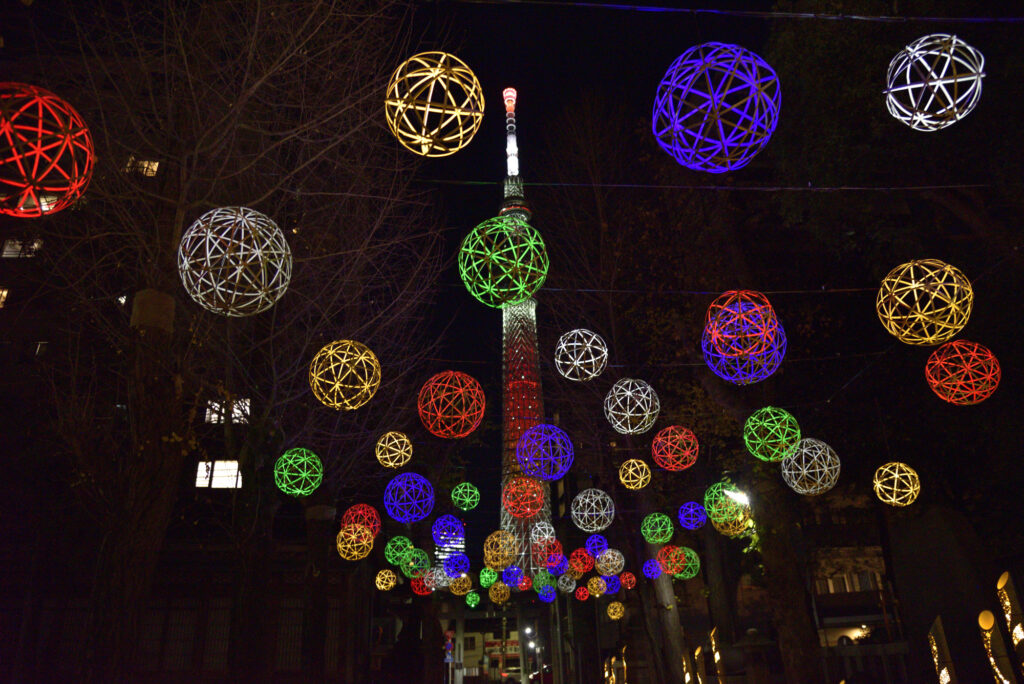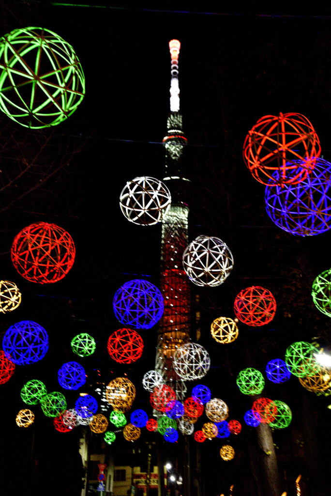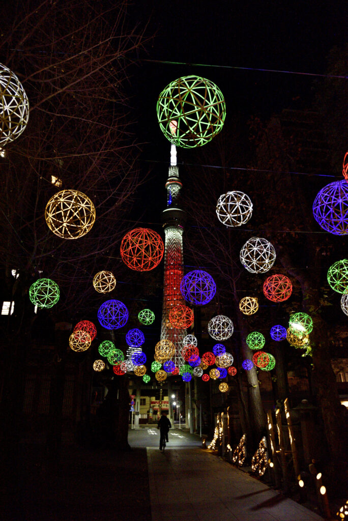 境内にはつるされた竹あかりも。東京スカイツーを背に映える
