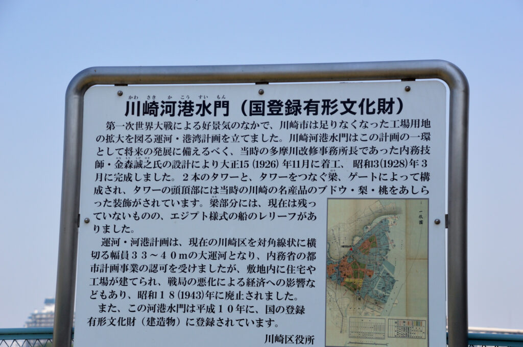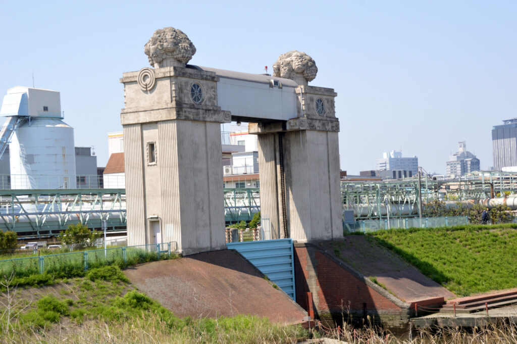 二子玉川駅 ここまで12km 川崎駅を過ぎ土手に 最初にあるのが川河港水門 国重要文化財