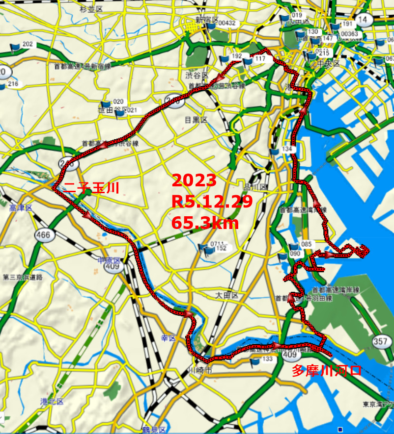 今年最後のボダリング さてどこに行こうか 思案の末国道246で二子玉川 河口に向かって左折神奈川県側の河口に向かう