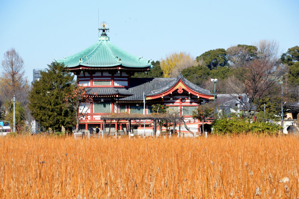 上野不忍池と辨天堂 上野動物園前の広場では骨董市