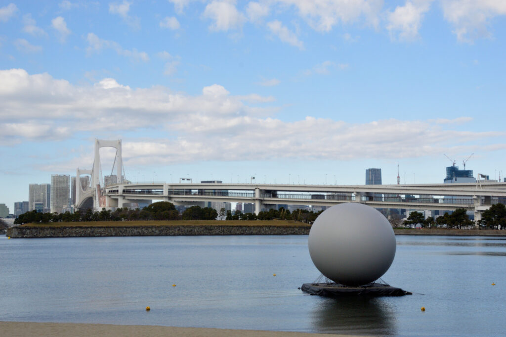 お台場海浜公園 レインボーブリッジと何かのイベント 海上に丸い球体