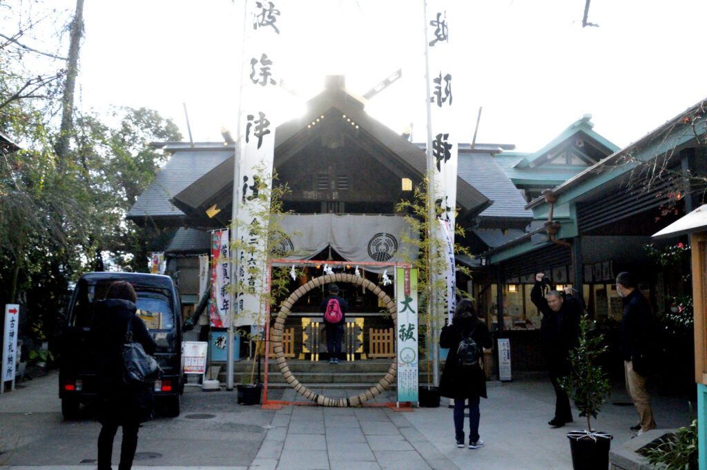 突き当たるが波除神社 倉稲魂命(うかのみたまのみこと)すなわち稲荷神を祭神とする稲荷神社の一つ。氏子は地域は築地の全域