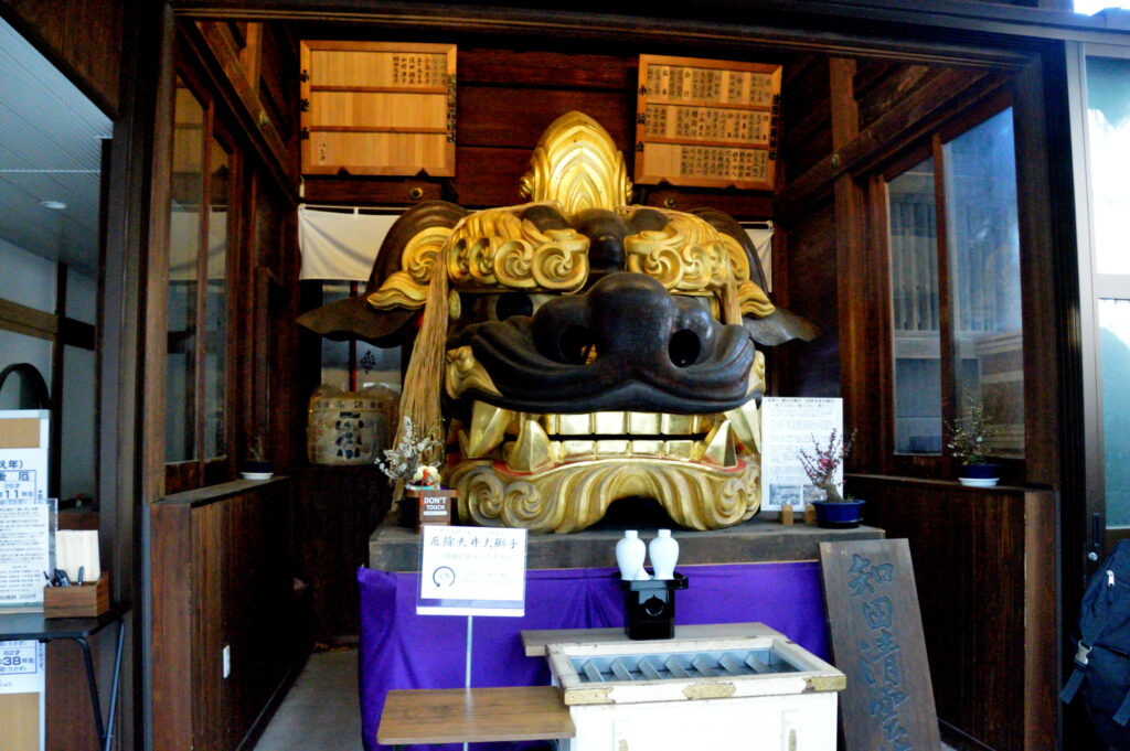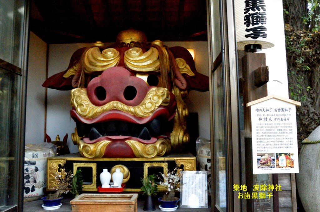 鳥居をくぐると左右におおきな獅子頭が鎮座 晴海通りで勝鬨橋を直進 有明通りに入り晴海大橋を渡り左折豊洲市場に向かう