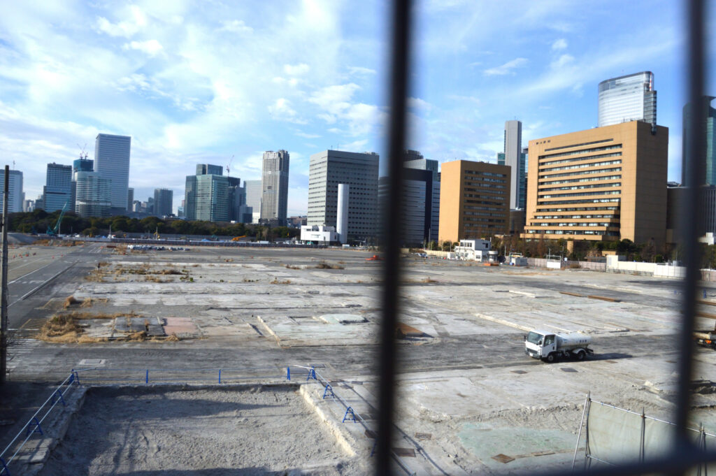 海幸橋棟屋上化から見た旧築地市場 オリンピック時駐車場に在った所 最近のニュースで跡地利用の入札があった 将来の景色がどのように