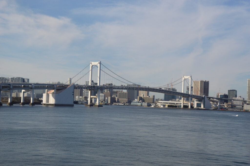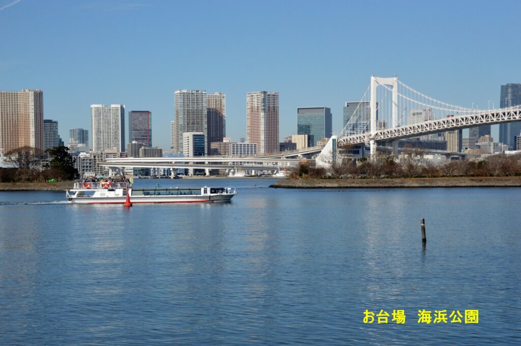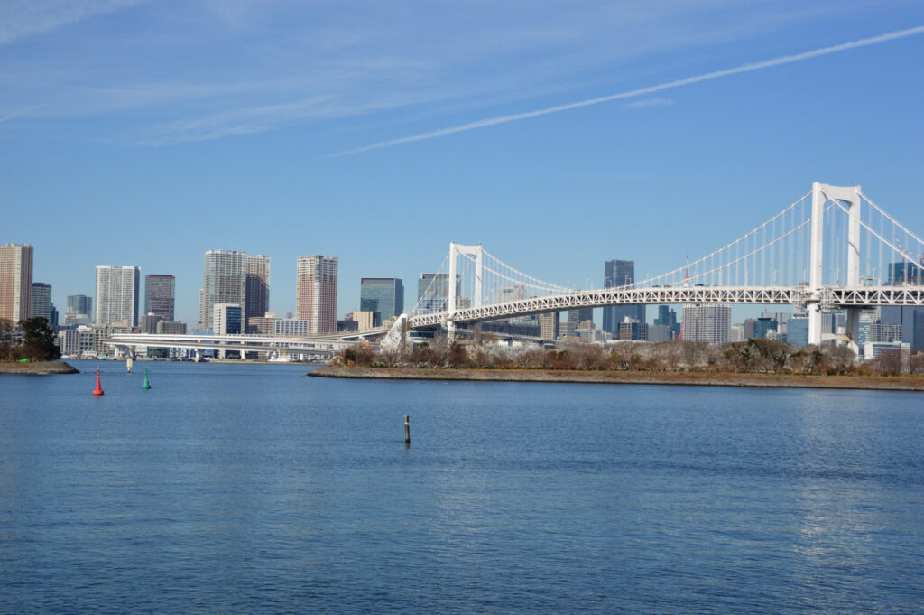 有明通りから豊洲市場 富士見橋からのぞみ橋を渡りお台場方面に向かう お台場海浜公園から対岸の高層ビル街