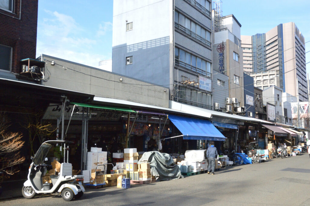 築地場外 左右にある市場棟を過ぎると極端に観光客減少する 飲食店がないからだと思う