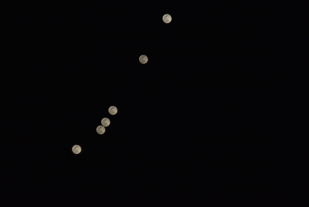 我が家屋上より ミットタウン 六本木ヒルズ 満月 画像と合成 軌跡はヘリ