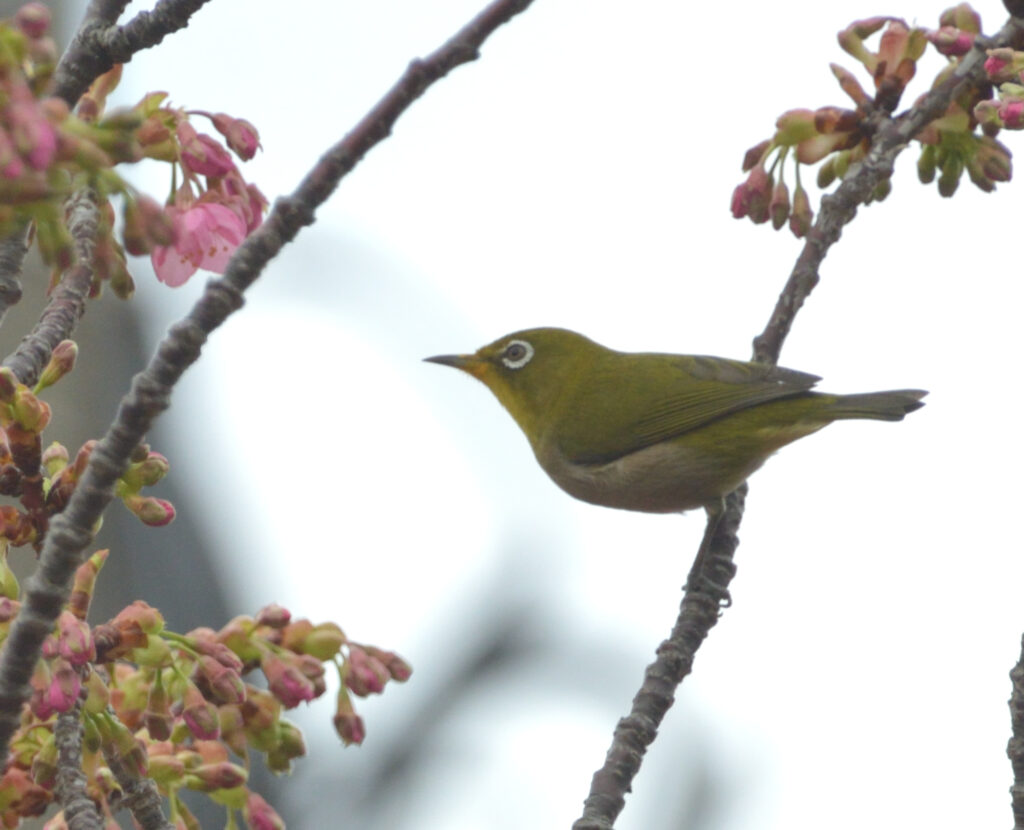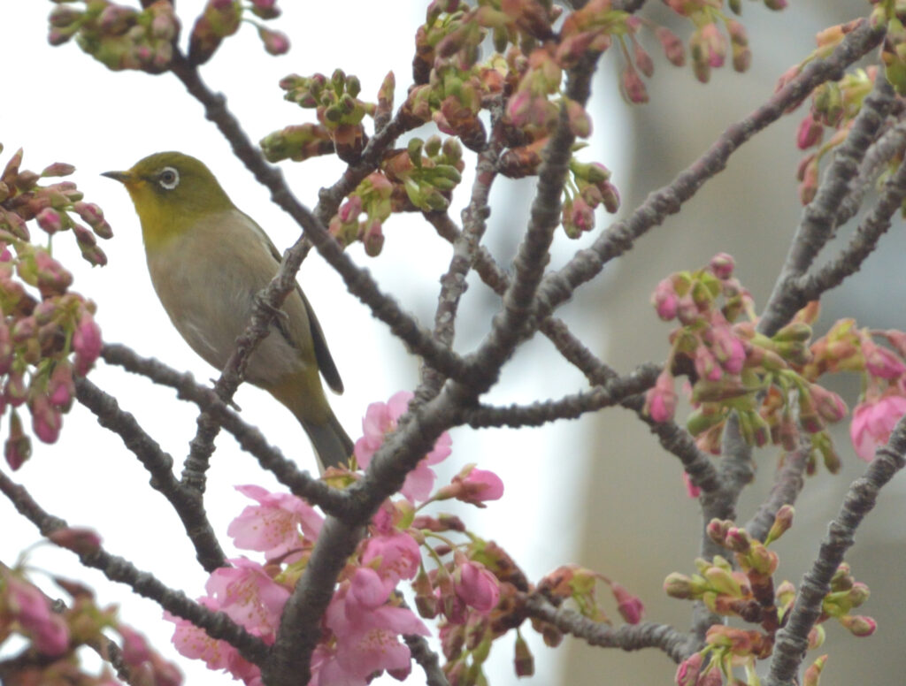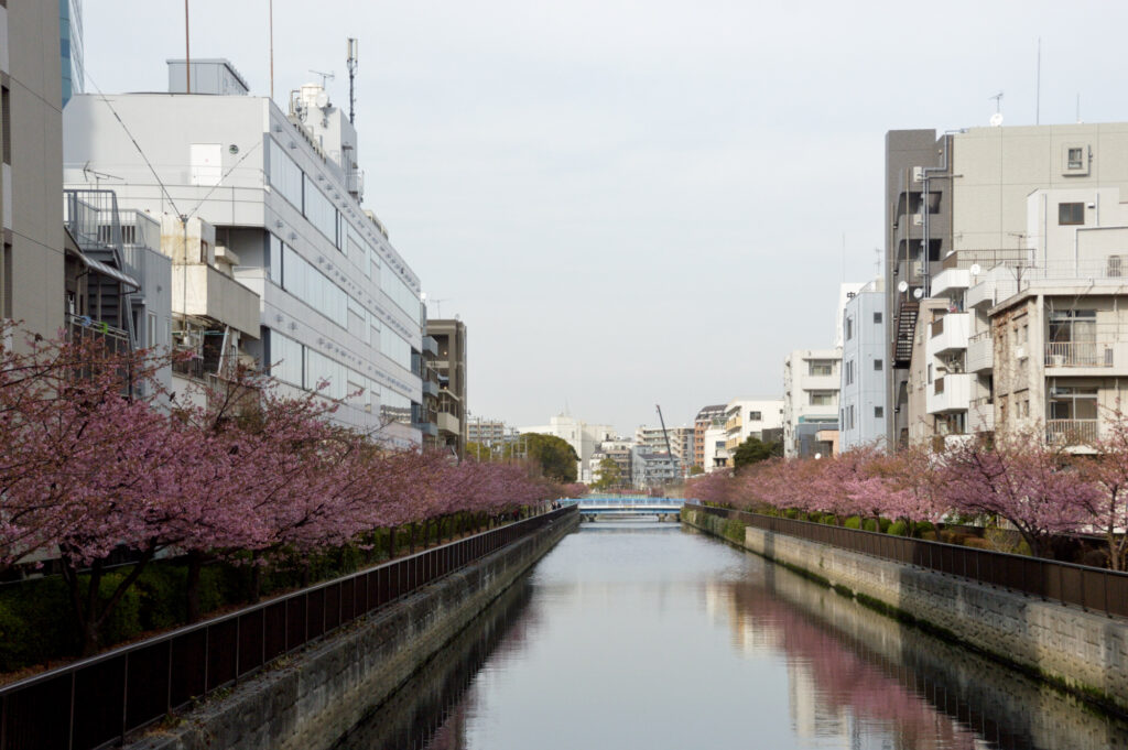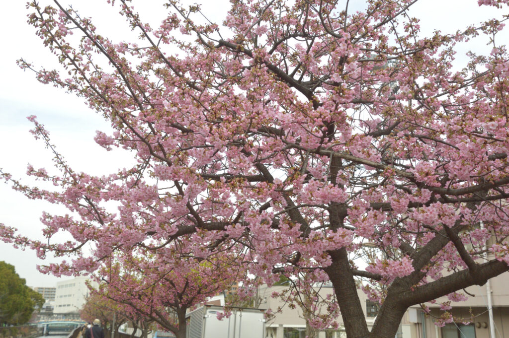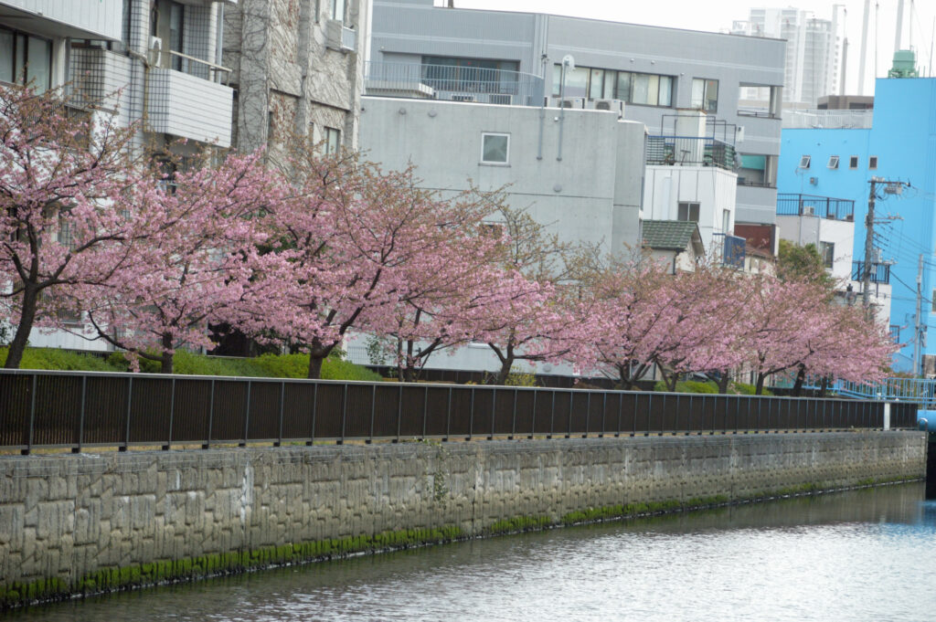 木場公園に到着 河津さくらを探すと大場川遊歩道両側に河津さくら