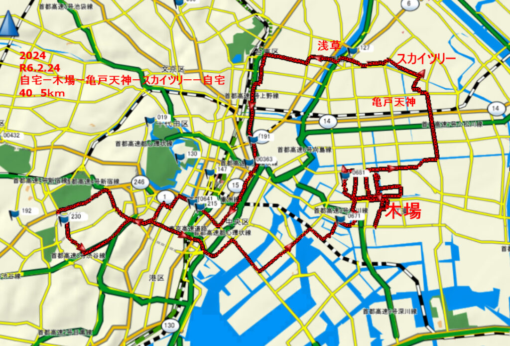 2月2回目の3連休 前後の天気予報 雨 今日24日 土曜日 束の間の晴れ間早朝築地場外 買い物 10時頃出発 六本木 虎ノ門 銀座 築地を抜け勝鬨橋を渡り越中島 門前仲町から 越中島 東京海洋大学 構内にある帆船 明治丸 今日は休日 柵の外から見て 木場公園に向かう 道と方角を勘違い大分ロス 木横川河津さくらを青空の下で見て 亀戸天神 梅を見に行く