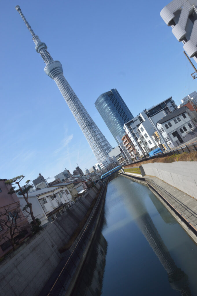 亀戸天神から押上スカイツリーを目指す 横十間川みかかる十間橋 風もないので川面に写るスカイツリー