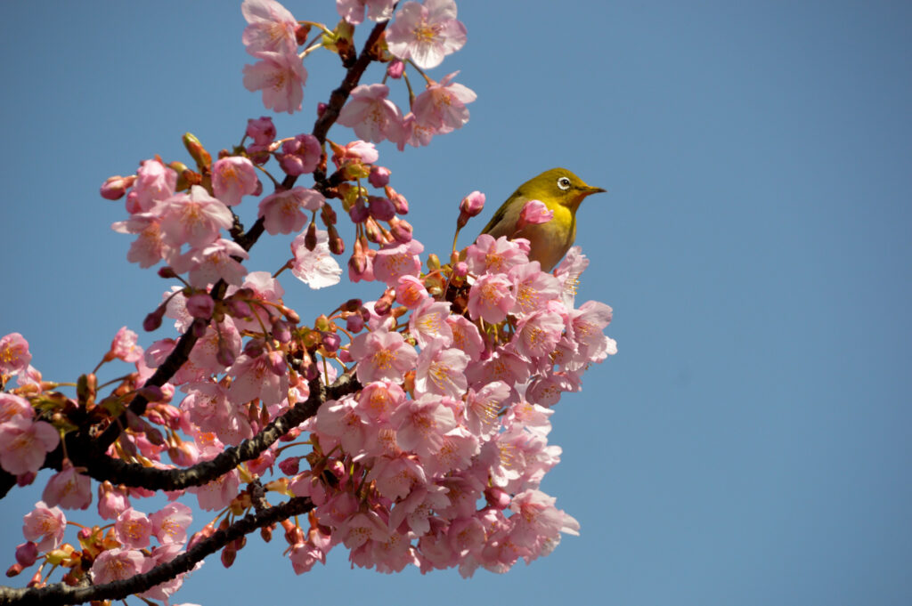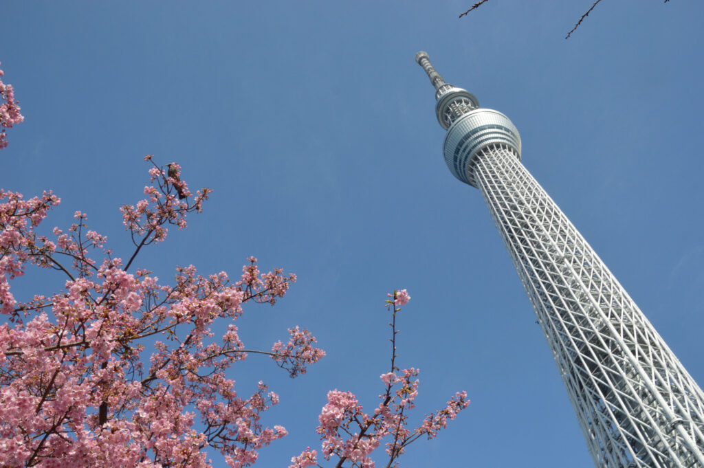 東武橋袂に咲く河津さくらとスカイツリー