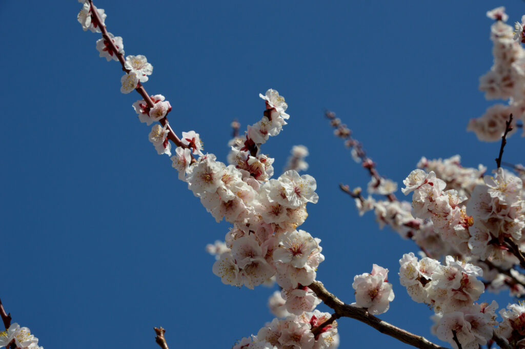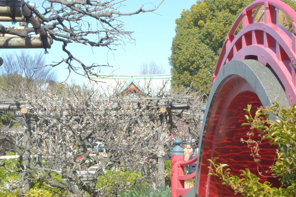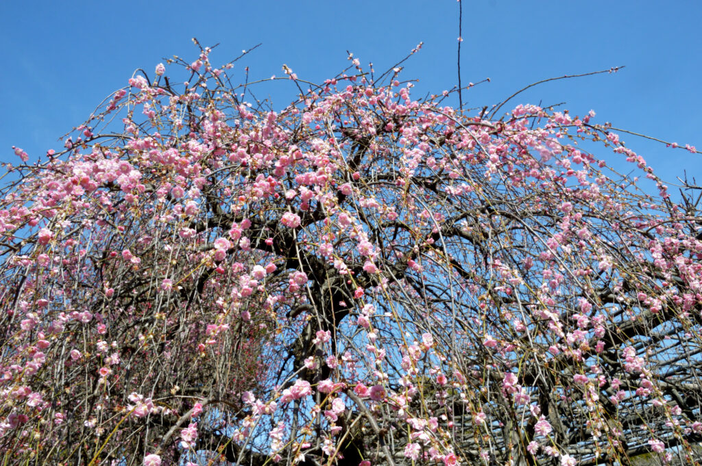 しだれ梅 二つある太鼓橋も絵になる